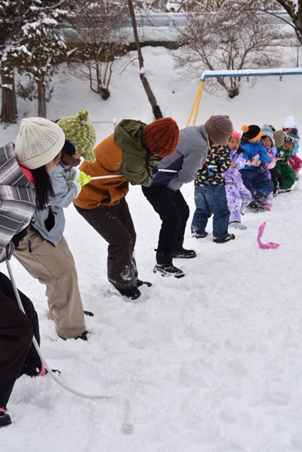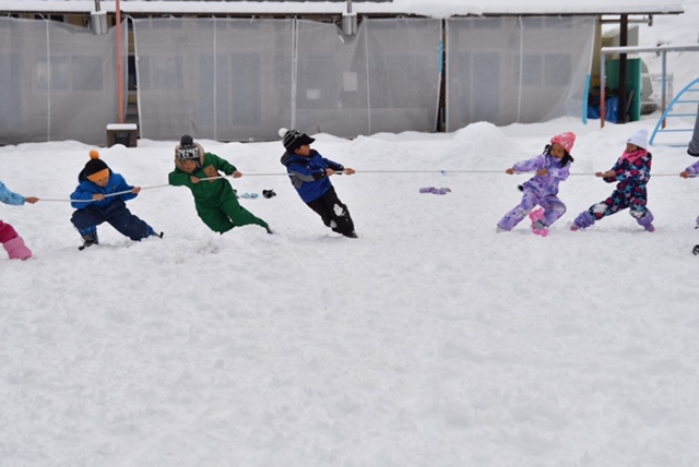 雪上での綱引き「よーいドン」