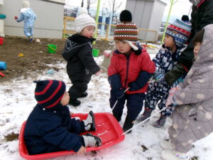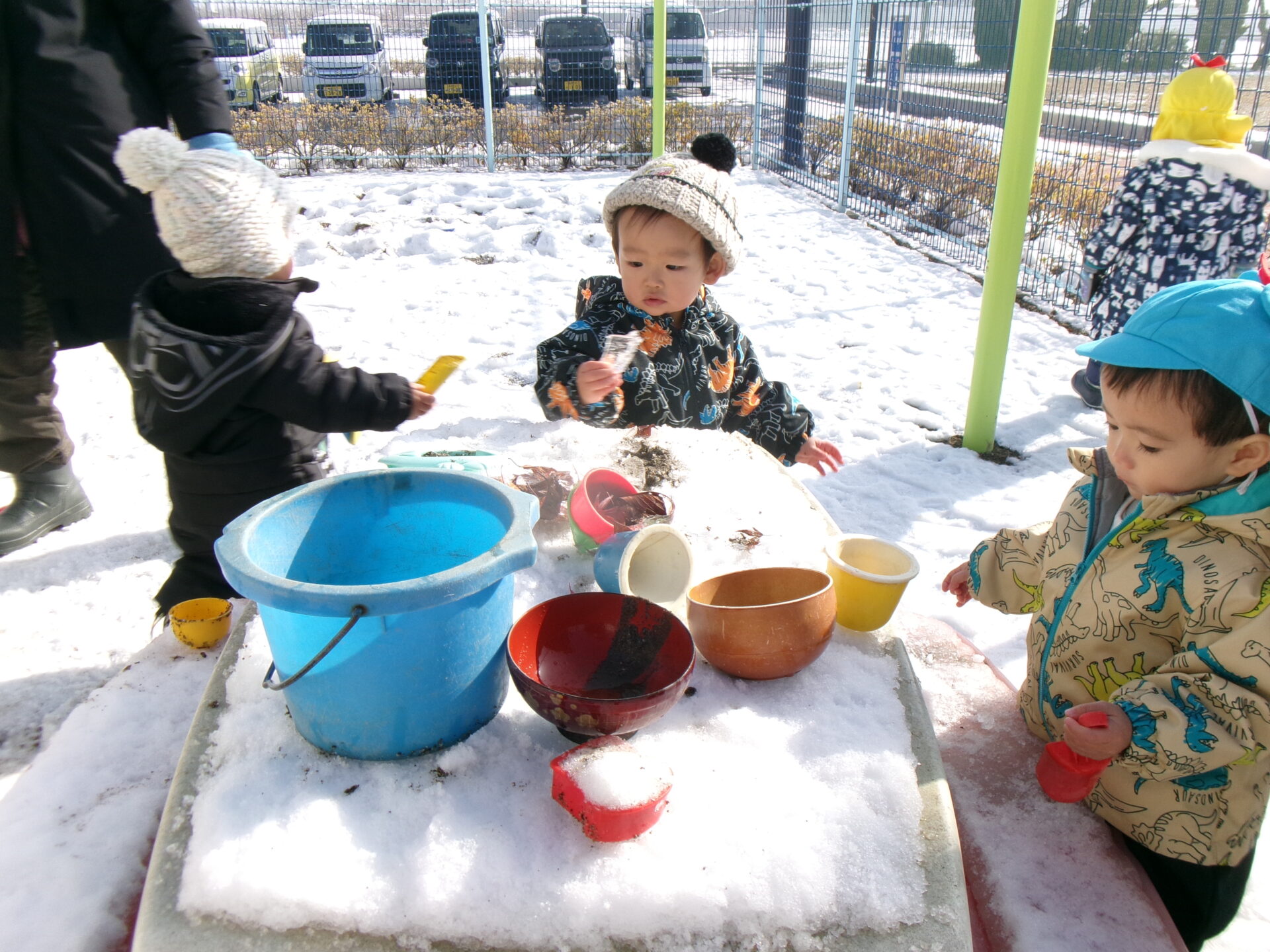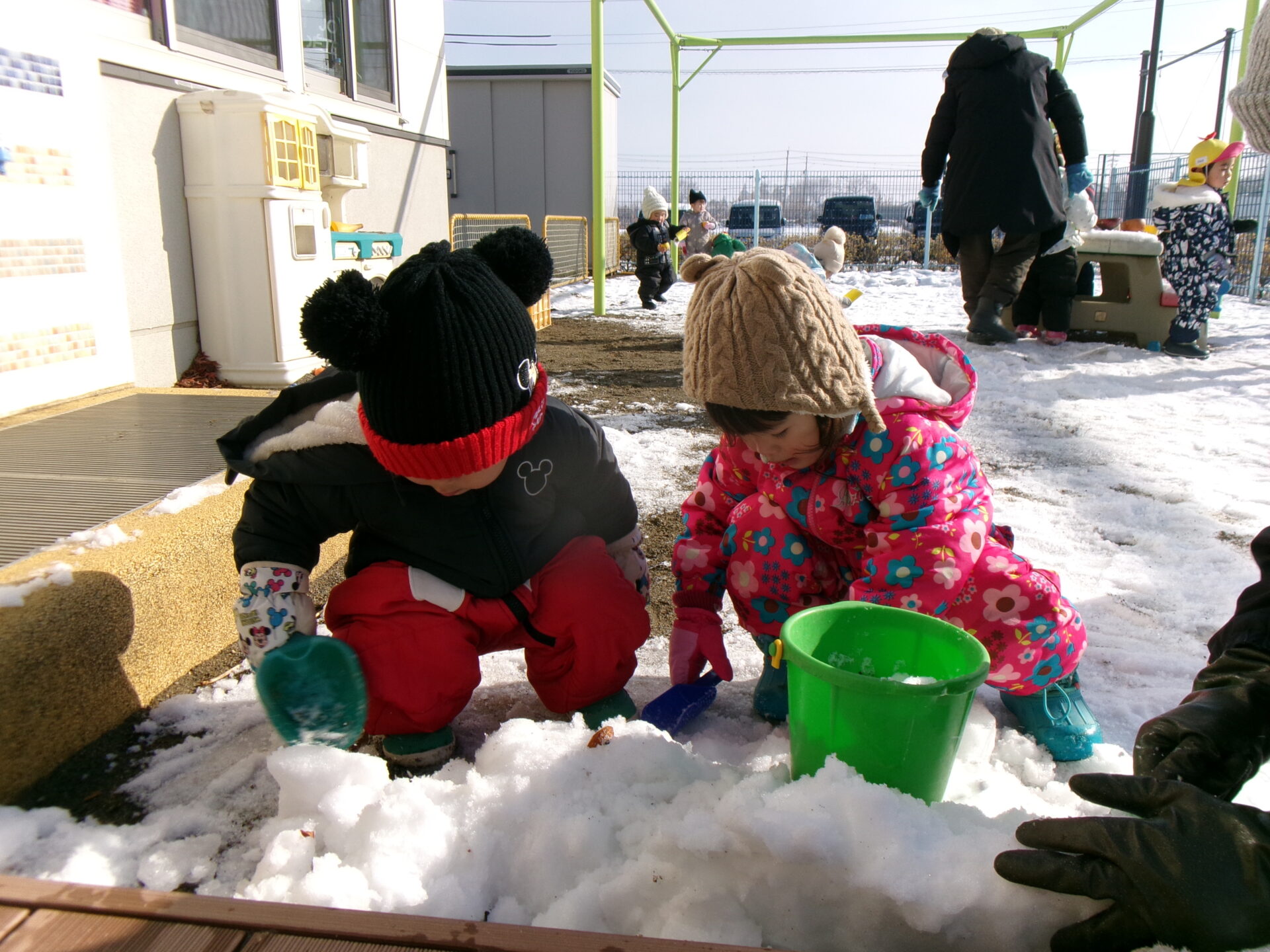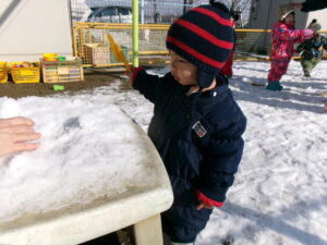 先日、園庭や校庭に積もった雪に触れて遊びました。 真っ白な雪を目の前にじっと見つめたり、そっと手を伸ばしたりする子どもたち。 冷たさを感じながら不思議そうに何度も触れていました!