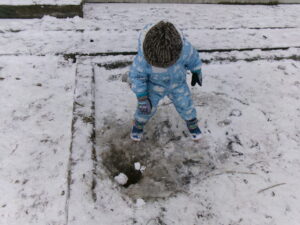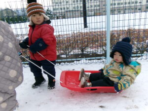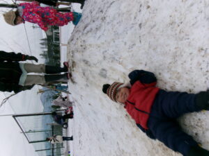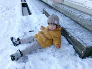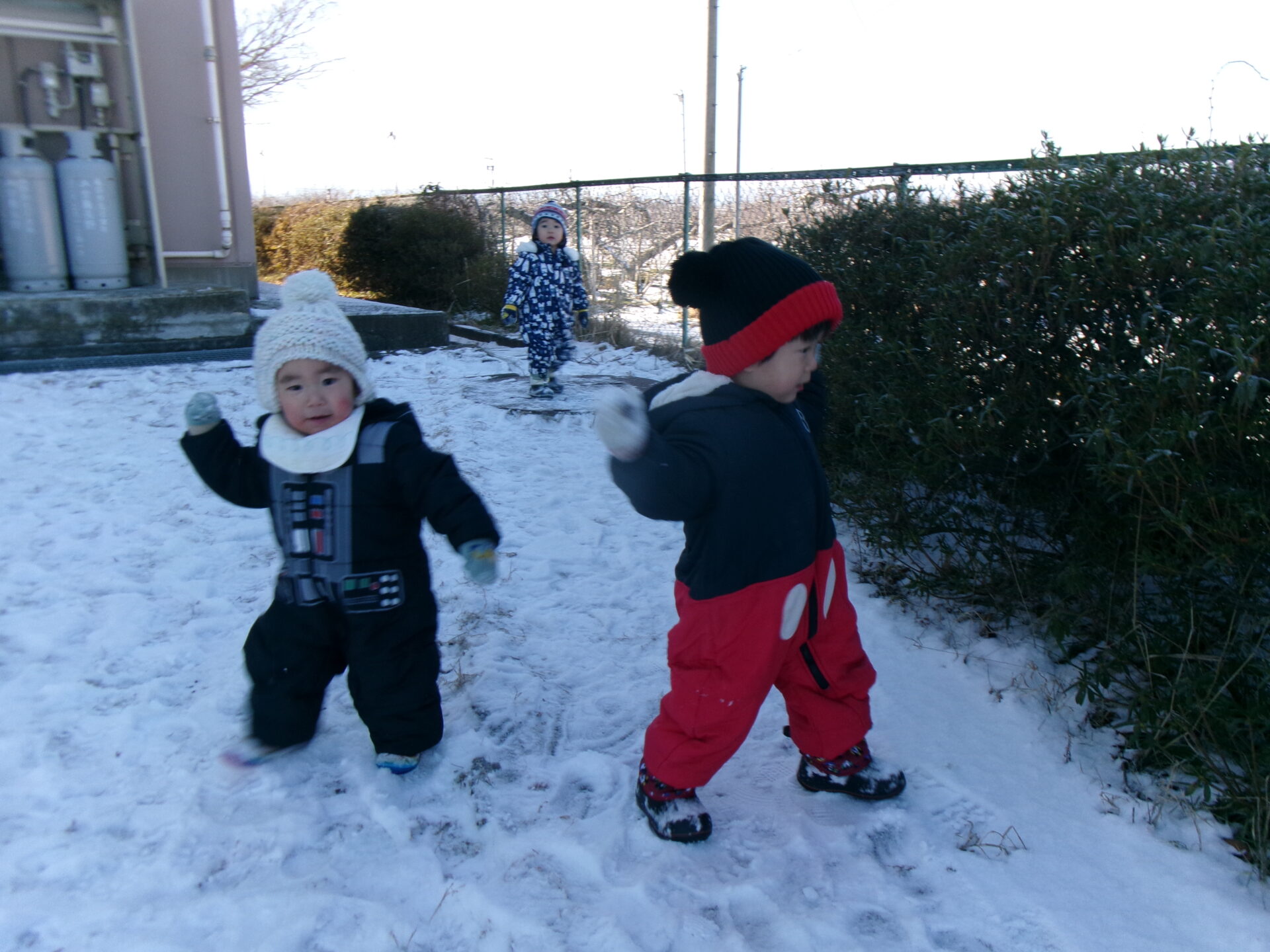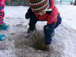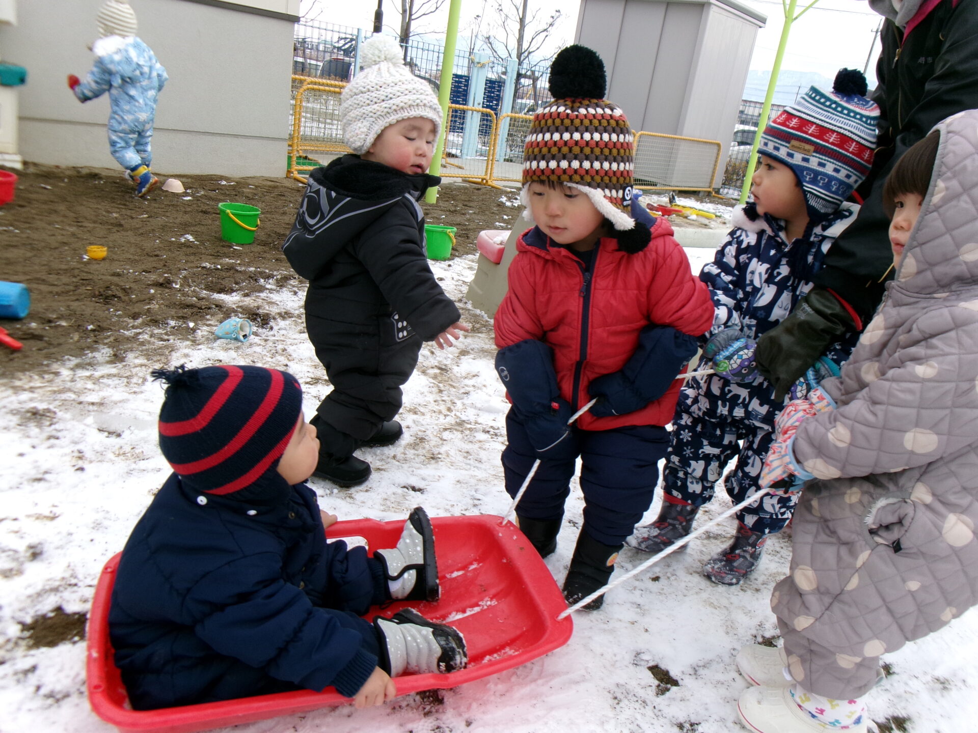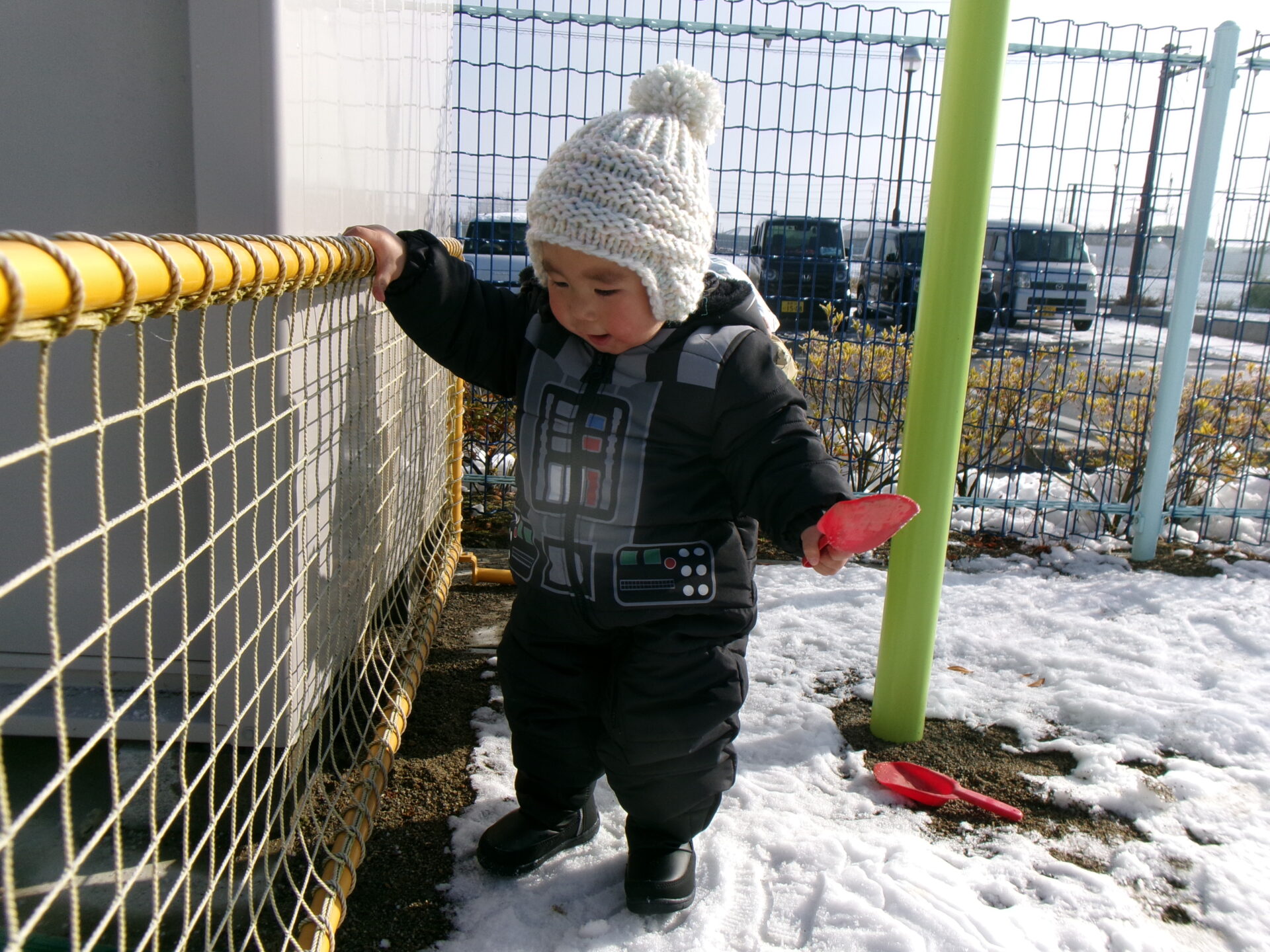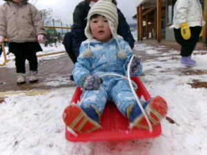 雪の冷たさや踏んだときの「ぎゅっ」という感触、足跡がつくおもしろさなど、子どもたちなりの小さな気付きがたくさん見られました。中には冷たくて涙してしまったり、早くお部屋に帰りたかったり…そんな姿もさくさんぼ組ならではで、冬の自然を全身で感じていることが伝わってきます。