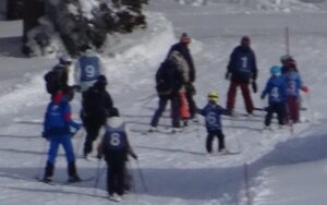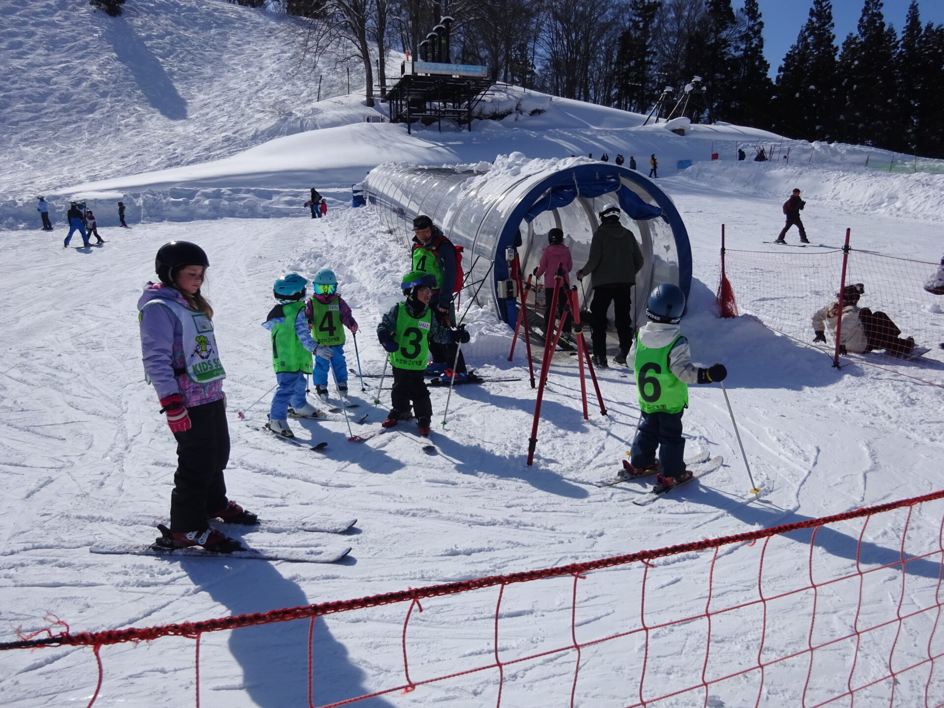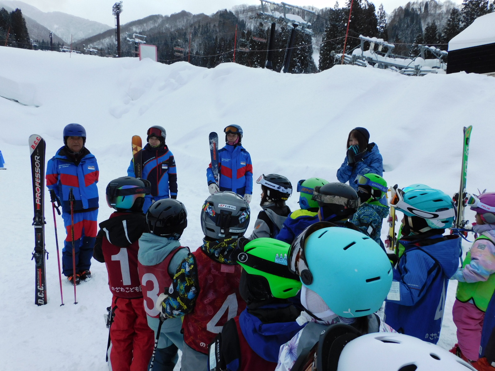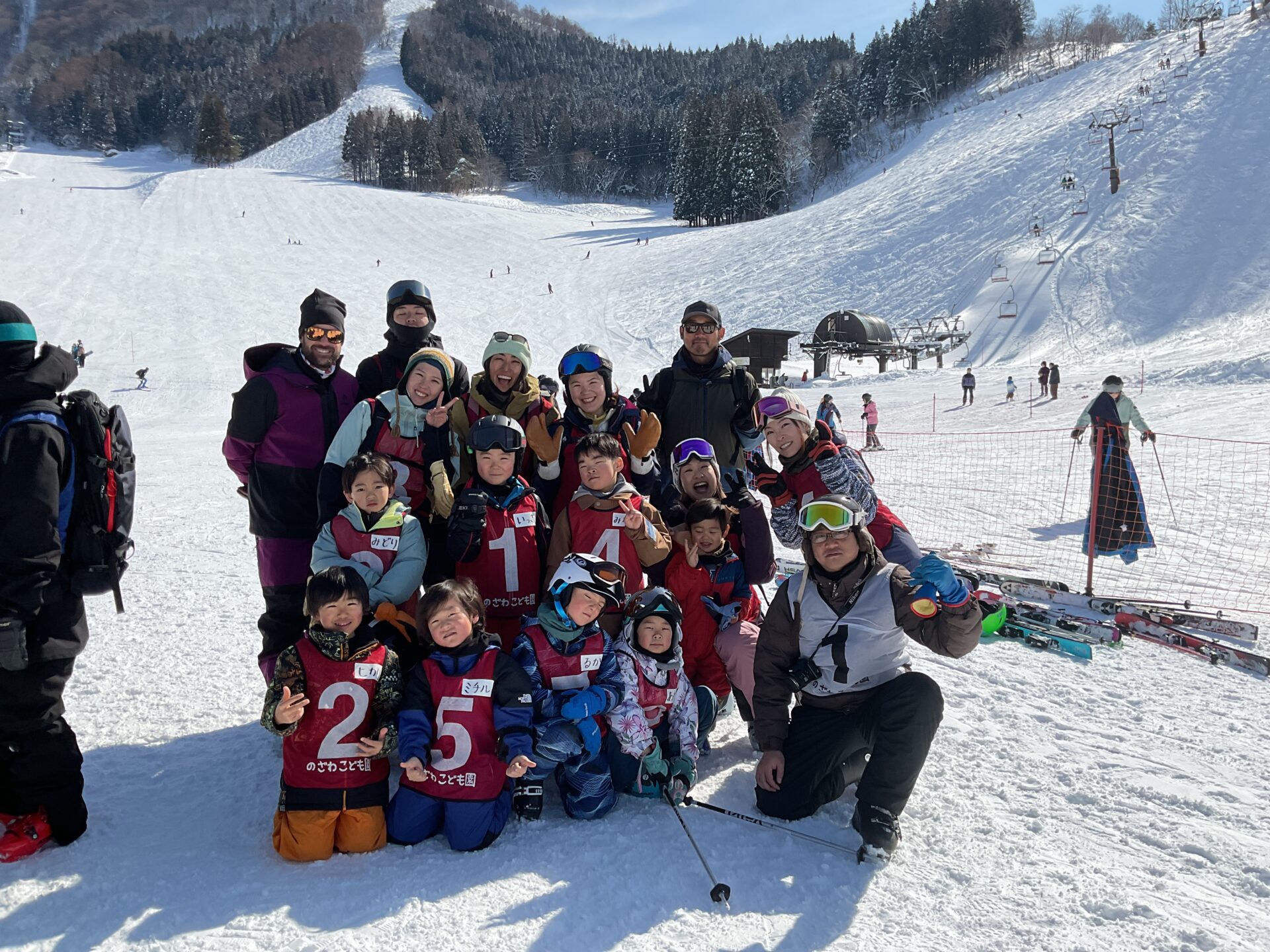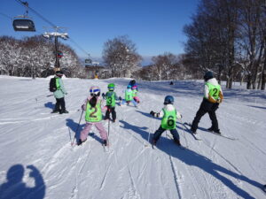 ゴンドラに乗っている間、カモシカがいるかなぁと探し「あっ!あそこにいたよ」「エッ、どこどこ?」「本当だ!」と大興奮だったり、ナスキーが描かれたゴンドラとすれ違い「あっ、ナスキーだ」と喜んだりとスキー以外のお楽しみもあったようです。コーチから「カモシカって牛と同じで胃が4つあるんだよ」と教えてもらいました。