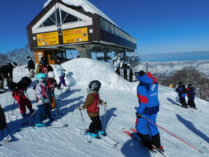 [楽しみでワクワク][ちょっぴり緊張でドキドキ]で迎えた開校式は、最初にコーチと引率してくれるお家の人に「お願いします」のご挨拶。その後グループごとに分かれてスタートです。どのグループも初回からゴンドラに乗って山頂を目指しました。