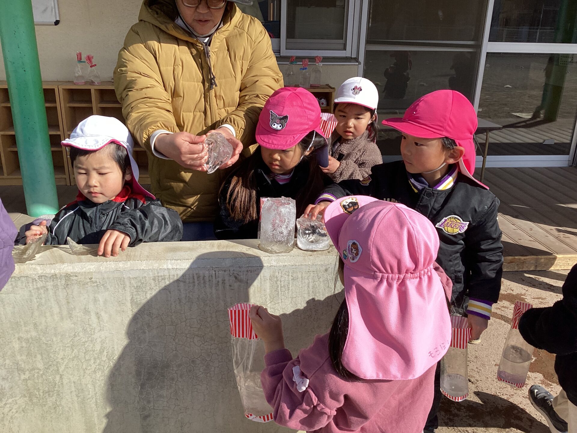 寒い朝には氷になっているが、帰るころには水に戻っていることに気が付き、暖かいところや太陽にあたるところに置いてあったからだと自分たちで発見し、友達同士で共有する姿もあった。また、場所や水の量によっては固まりきらず、水のままのこともあった。しかし、自分のが固まっている子は友達や他の年齢の子にも見せてあげたり、触らせてあげたりする優しい姿も見られた。