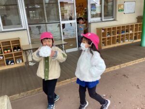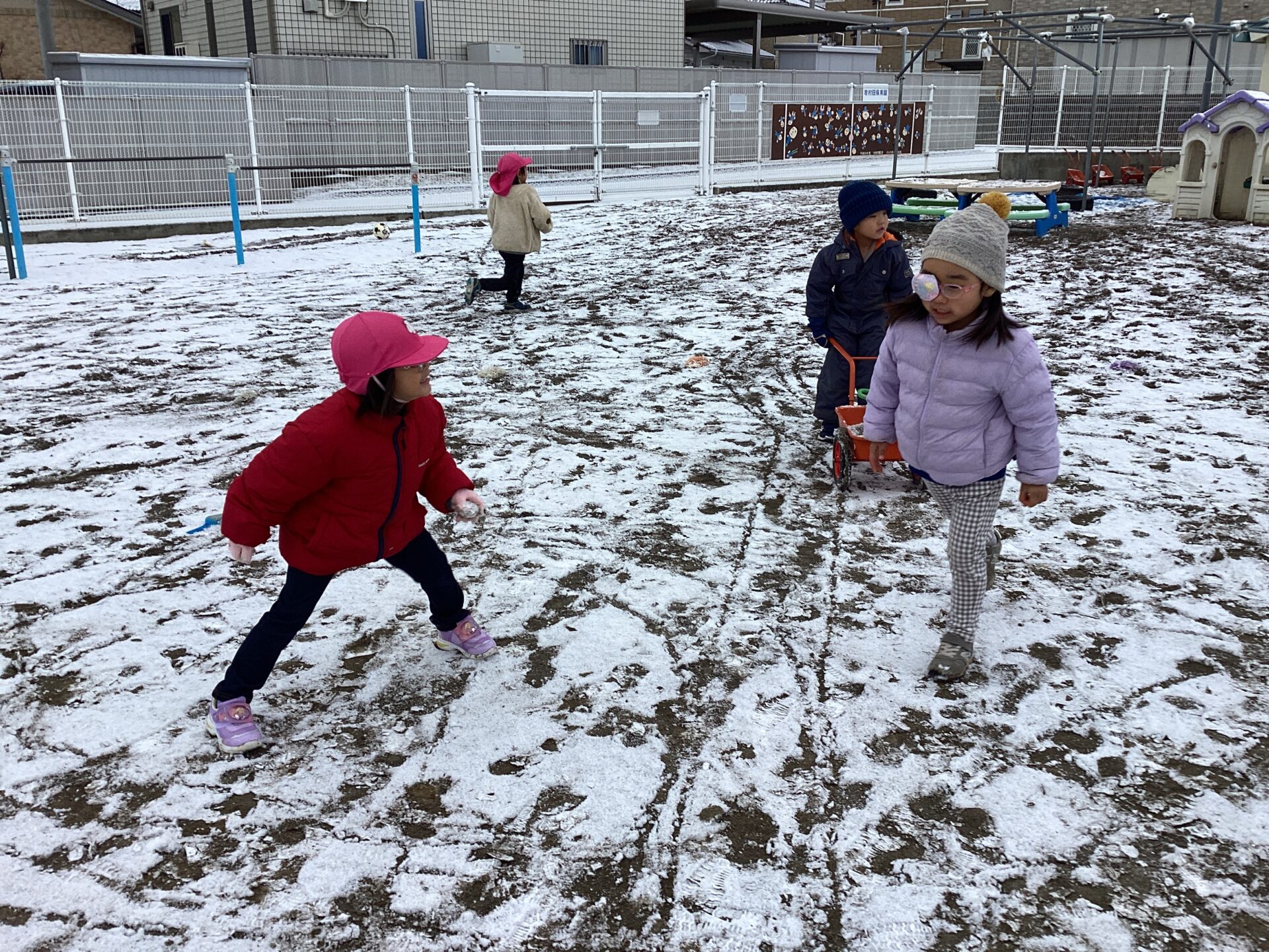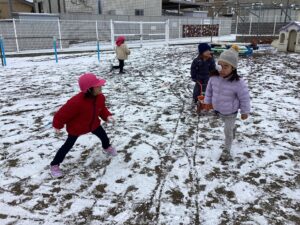翌日雪が降り、園庭に雪が少し残り、歩くと足形が付くのを楽しんでいました。手押し車のタイヤの跡が線路みたいになって電車ごっこが始まりました。