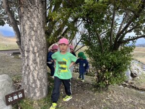 ・「○○さーん」と、遠くで作業をしていらっしゃった施設職員の方に声をかけていました。夏の年長特別保育の折に、川の生き物の事や石ころアートを教えて下さった『自然の先生』です。自分達の好きな生き物の事や知らない事を親切丁寧に直に触れ合いながら教えてくださる事で、年長児も覚えていたのだと思います。