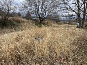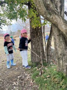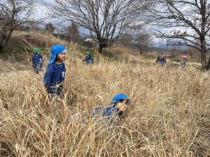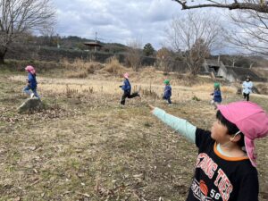 ・季節的にバッタなどの生き物は見当たらず草木も茶色ですが、子ども達にとってはそんな今の自然環境も楽しく探求心をくすぐる場所でした。異年齢の関りが深まている今だからこそ、自分の体験を伝えたり一緒に遊び楽しんだりお互いの遊びを目の端に入れながら真似したりと、そんな姿が広い原っぱのあちこちで見られたりしました。このような環境が身近にある事が嬉しく思います。