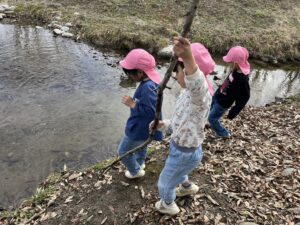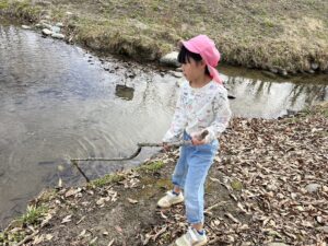 ・「ここはかわらんべ散歩できたところ」「魚、いないね」「前来た時は、いっぱいいたのにね」と、年長児が、以前年長特別保育で来た時に見たり体験した時の事を話していました。