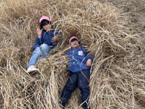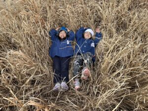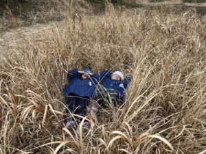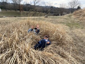 ピンク帽子の年長児は走り回って鬼ごっこをしていましたが、この枯れ草を見て隠れられることに気づき『かくれんぼ鬼ごっこ』に変化していきました。その年長の様子を見て青色帽子の年少児も真似していました。