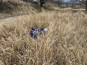 ピンク帽子の年長児は走り回って鬼ごっこをしていましたが、この枯れ草を見て隠れられることに気づき『かくれんぼ鬼ごっこ』に変化していきました。その年長の様子を見て青色帽子の年少児も真似していました。