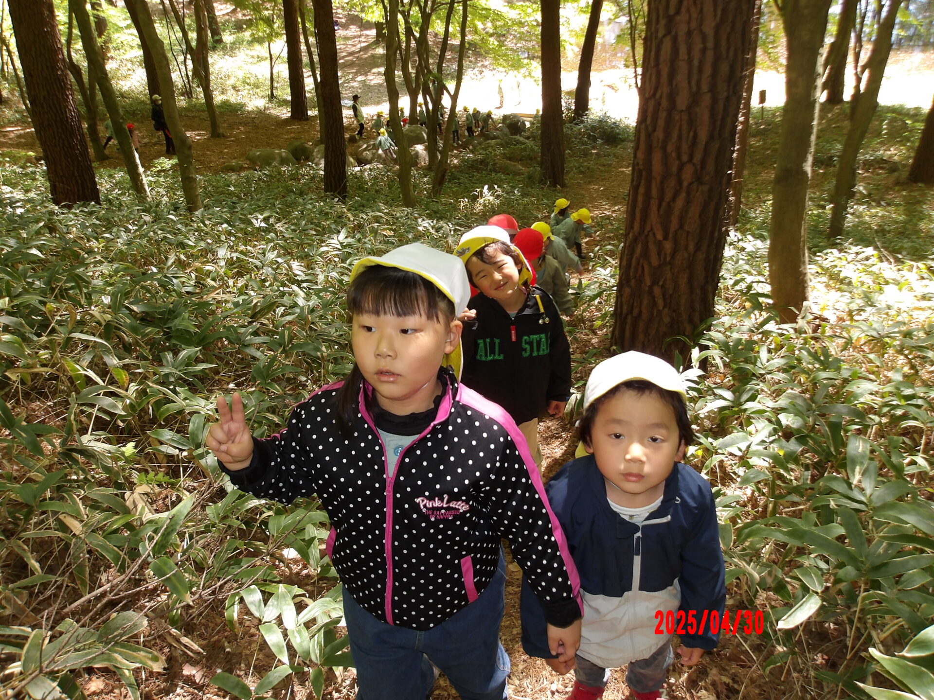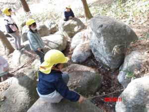 春ーながた自然公園で散策をして岩登りや自然物を使って遊びました。