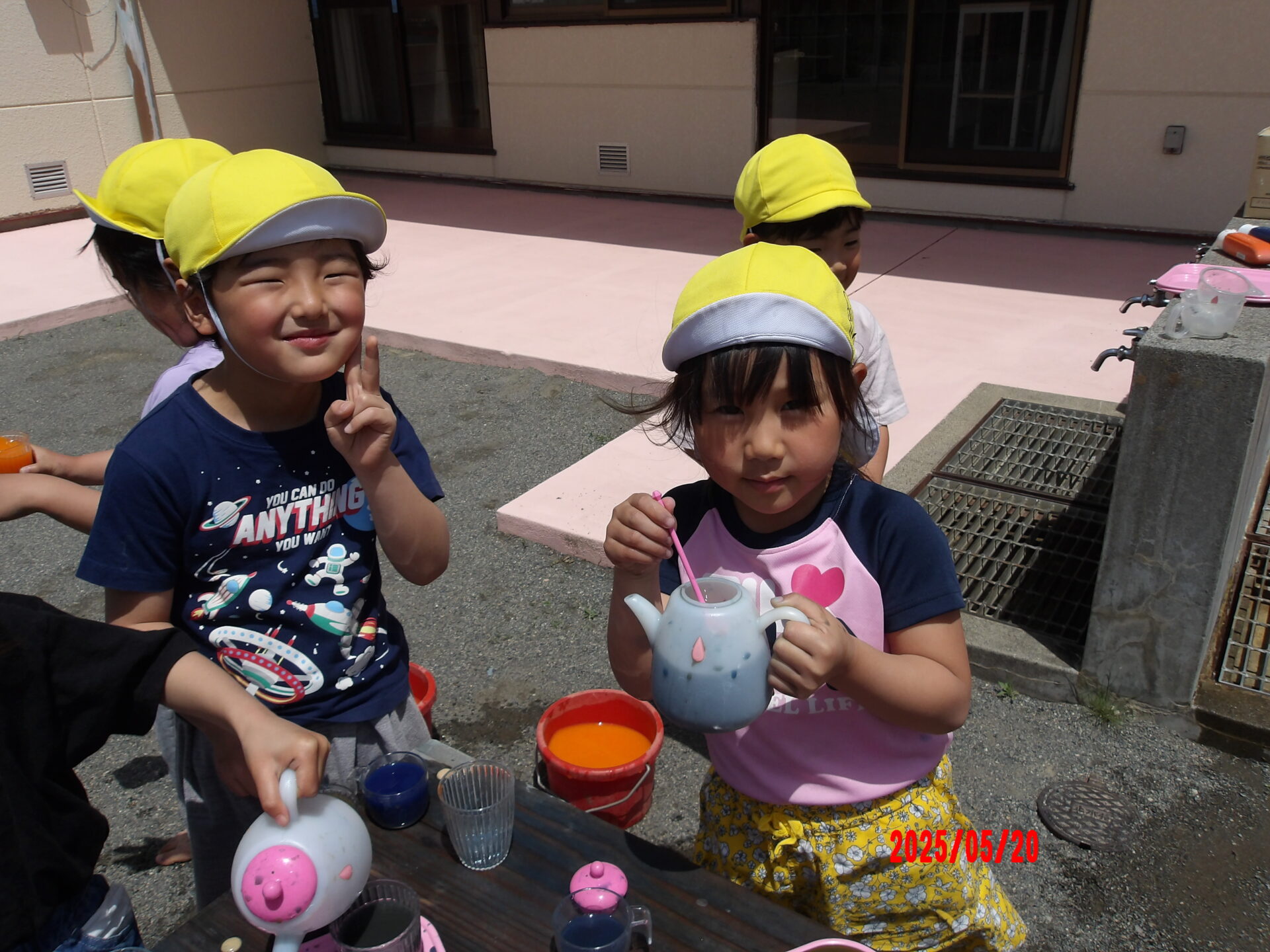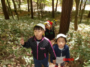 こどもたちは岩の冷たさ、木のぬくもり、風の音に耳を澄ませ、自然物を使った色水の色、自然の中にはたくさんの発見があることに気づきました。