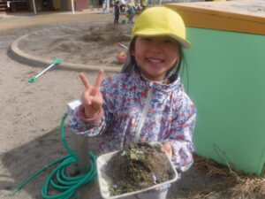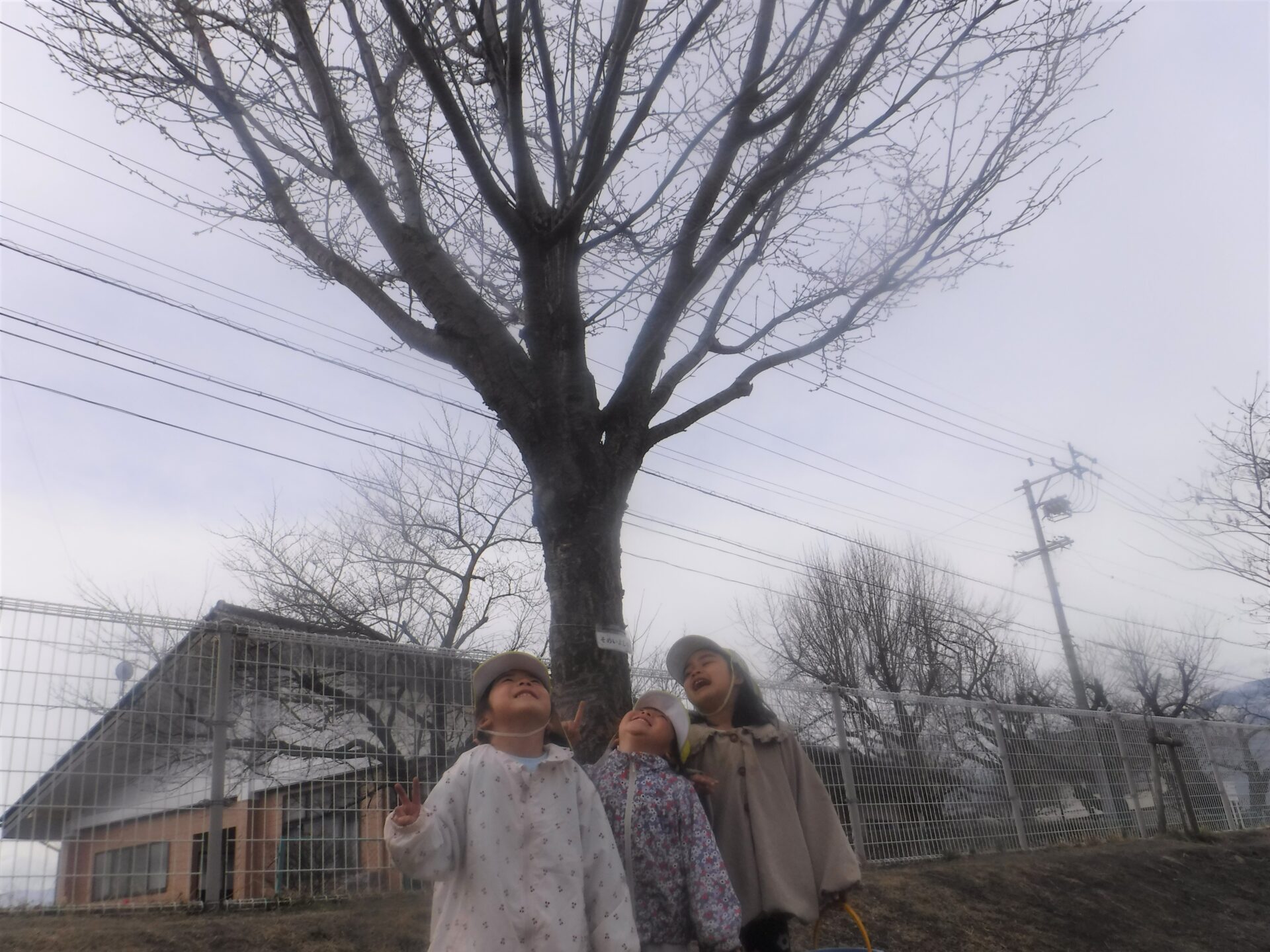 ・自然の持つ温かさ、風のにおい、感触など五感を使ってたくさんの驚きや発見をしながら、春の訪れを感じてほしいと思っています。この桜がきれいな花を咲かせた頃、みんなは年長さん。みんなの大好きな春は、もうすぐそこまで来てますよ。