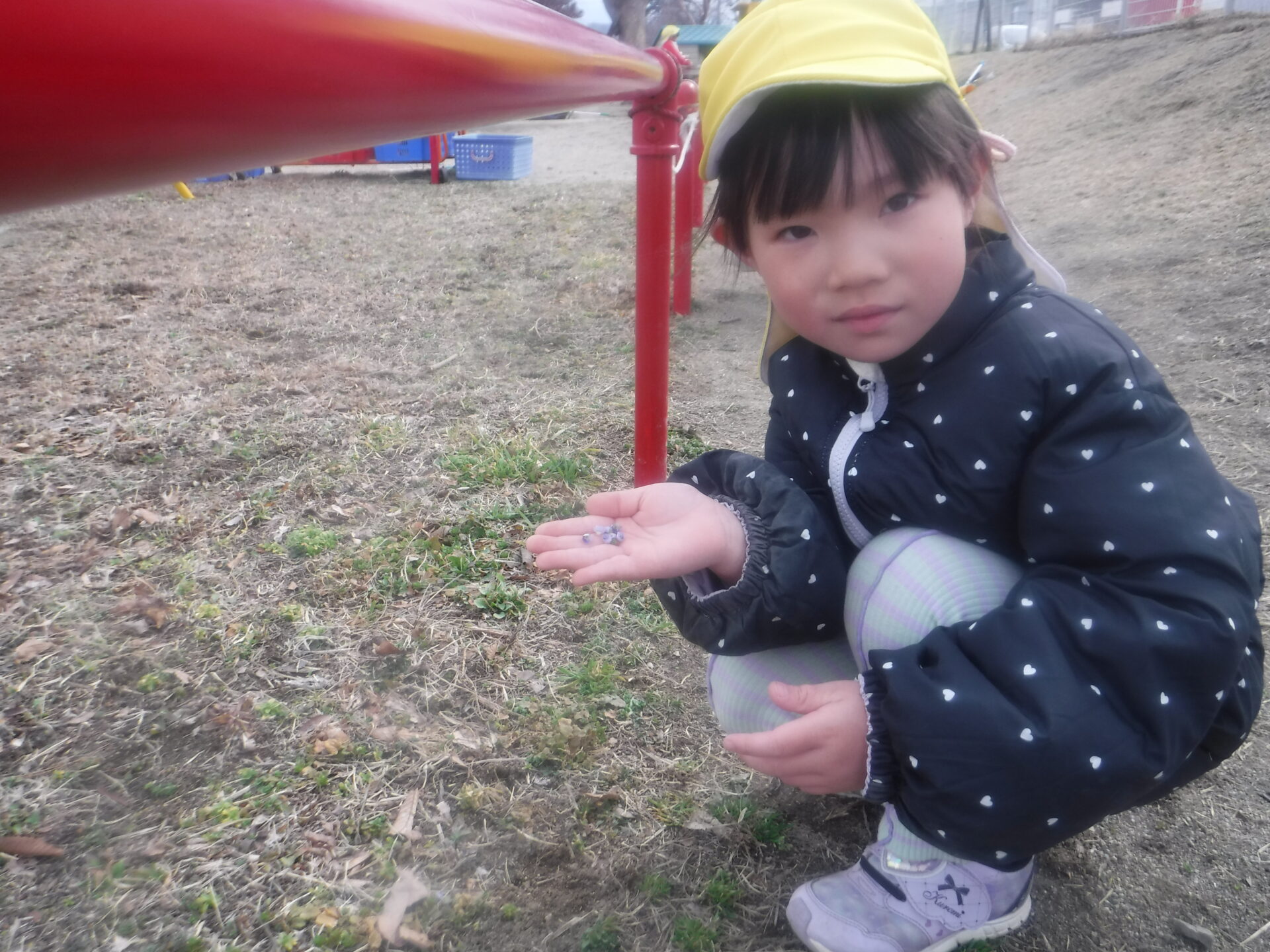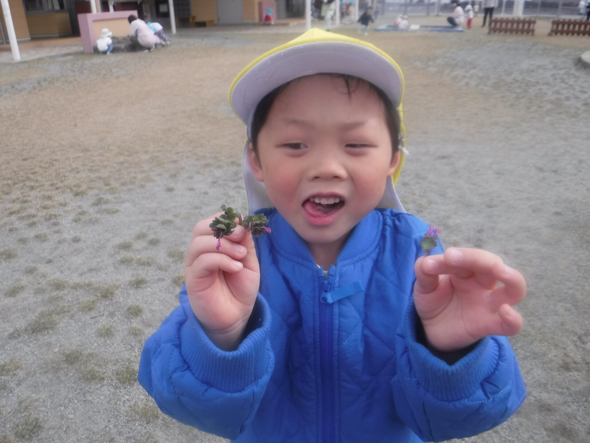 「これかわいいでしょ。ピンクのお花、何ていうお花?」「これは、”ほとけのざ “だよ」