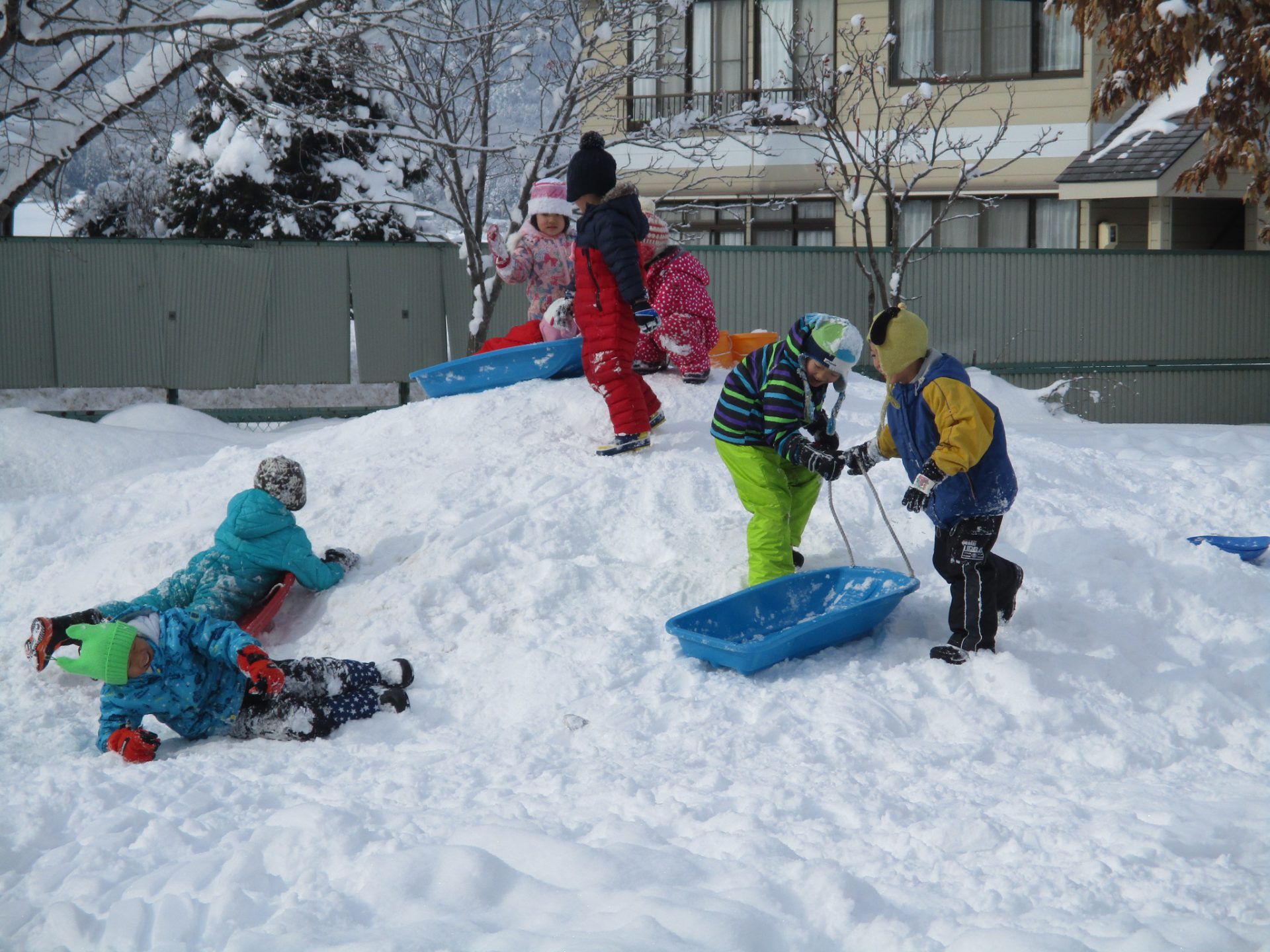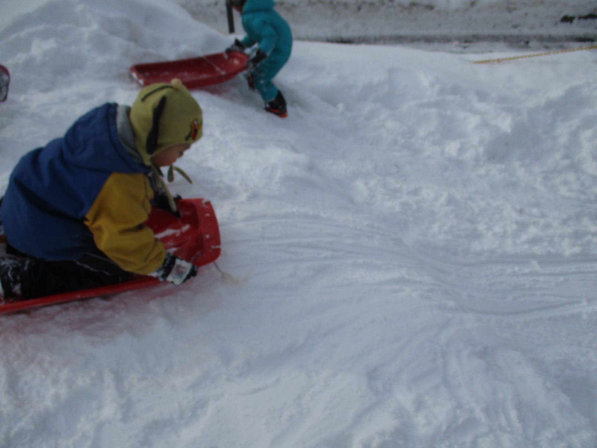 そりは一人一つないので交代で。すべる場所と登る場所も自然に何となく決まっていきます。「ちがうよ!こっちから登って!」「◯◯くん!どいてー!いくよー!」声を掛け合ったり、けんかをしたりしながらルール作りもしていきます。