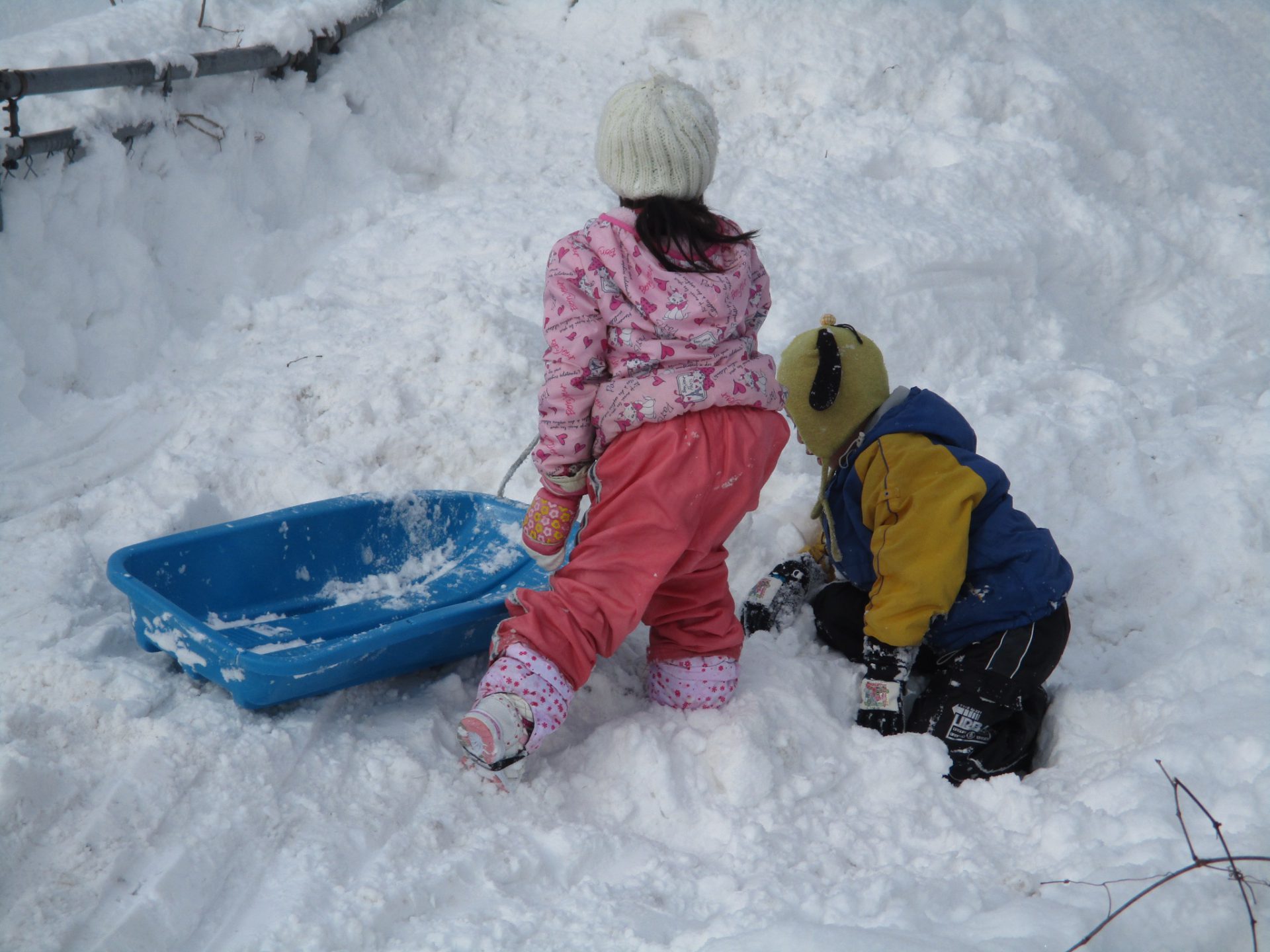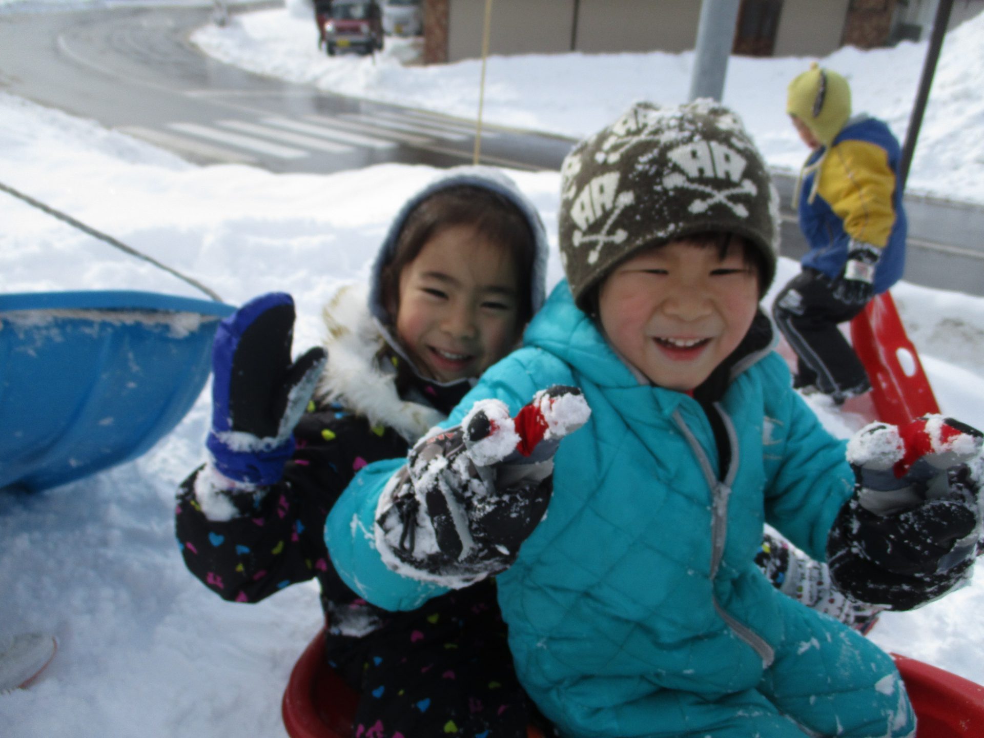 園庭の端の坂道にも雪がつもり、ちょうどいいそりの道ができました。「ここですべってもいい?」急な坂道で勢いがついてしまうので雪を運んでなだらかにしたらオッケーということにしました。せっせとそりで雪を運び完成です!歓声をあげて楽しみました。