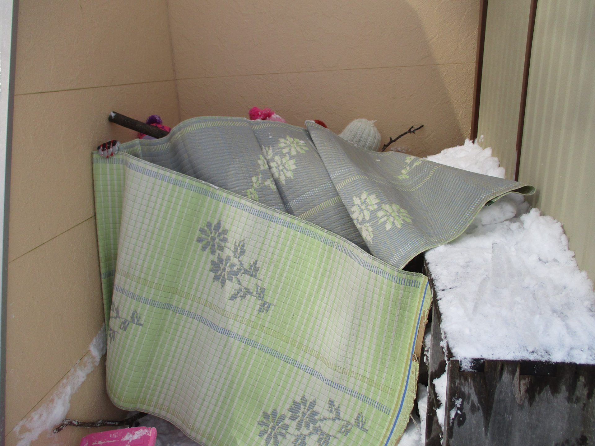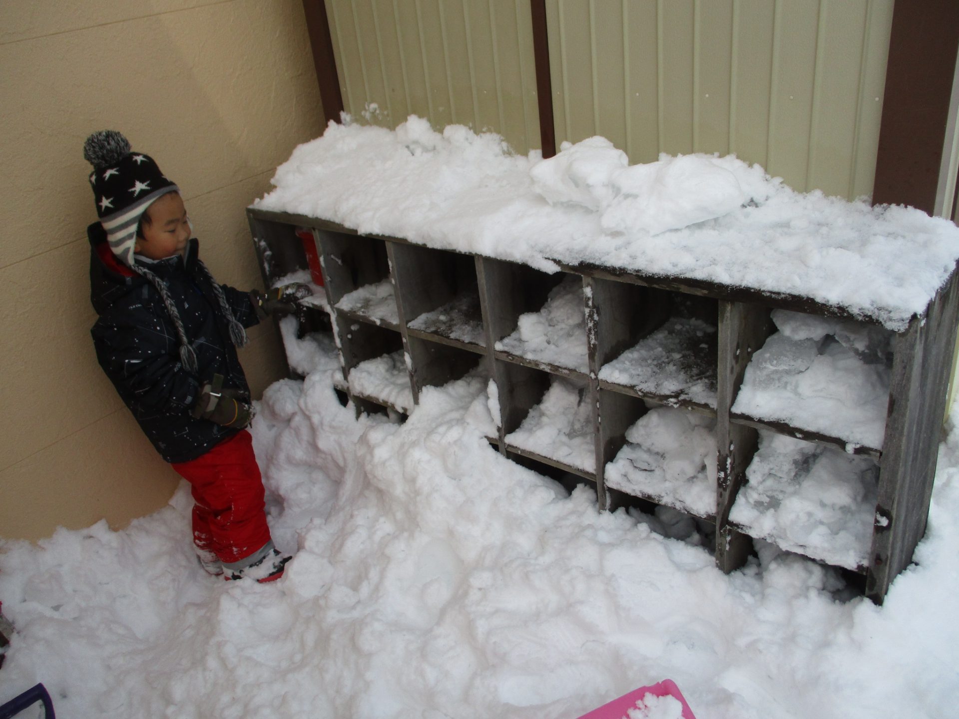 夏にはどろんこ遊びで、秋にも大活躍したみんなに冷蔵庫と呼ばれている、古い下駄箱。冬は天然の冷蔵庫です。ここをお家にしよう!と作り出した子供達。