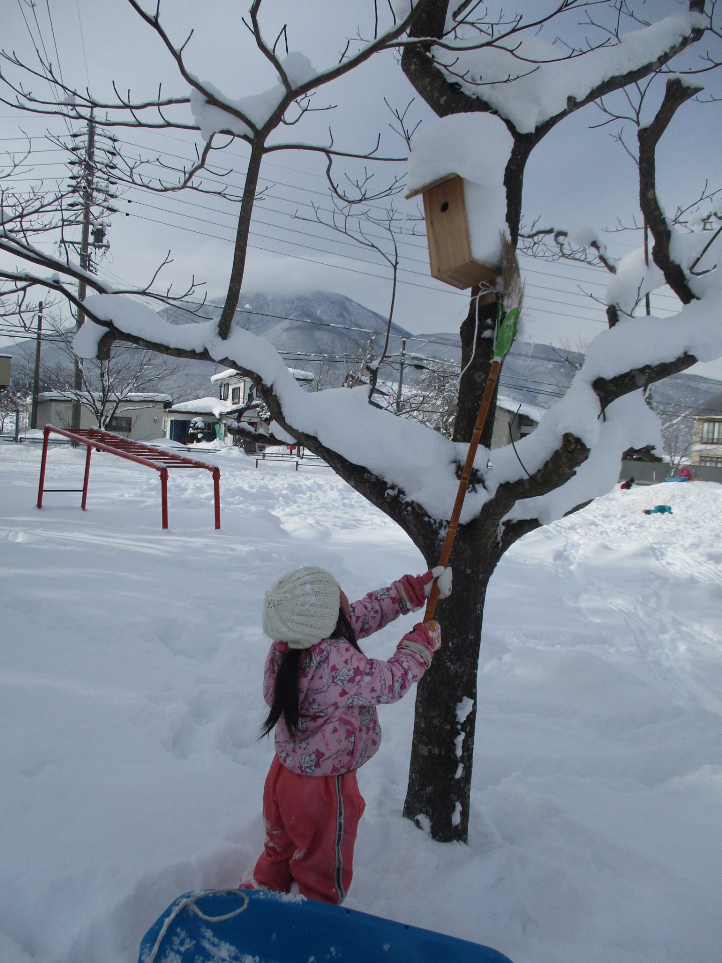 「この間かけた巣箱に雪が積もってる!かわいそう!」雪を払ってあげたかったようなので「これどう?」とほうきをだすと、丁寧に払ってあげていました。