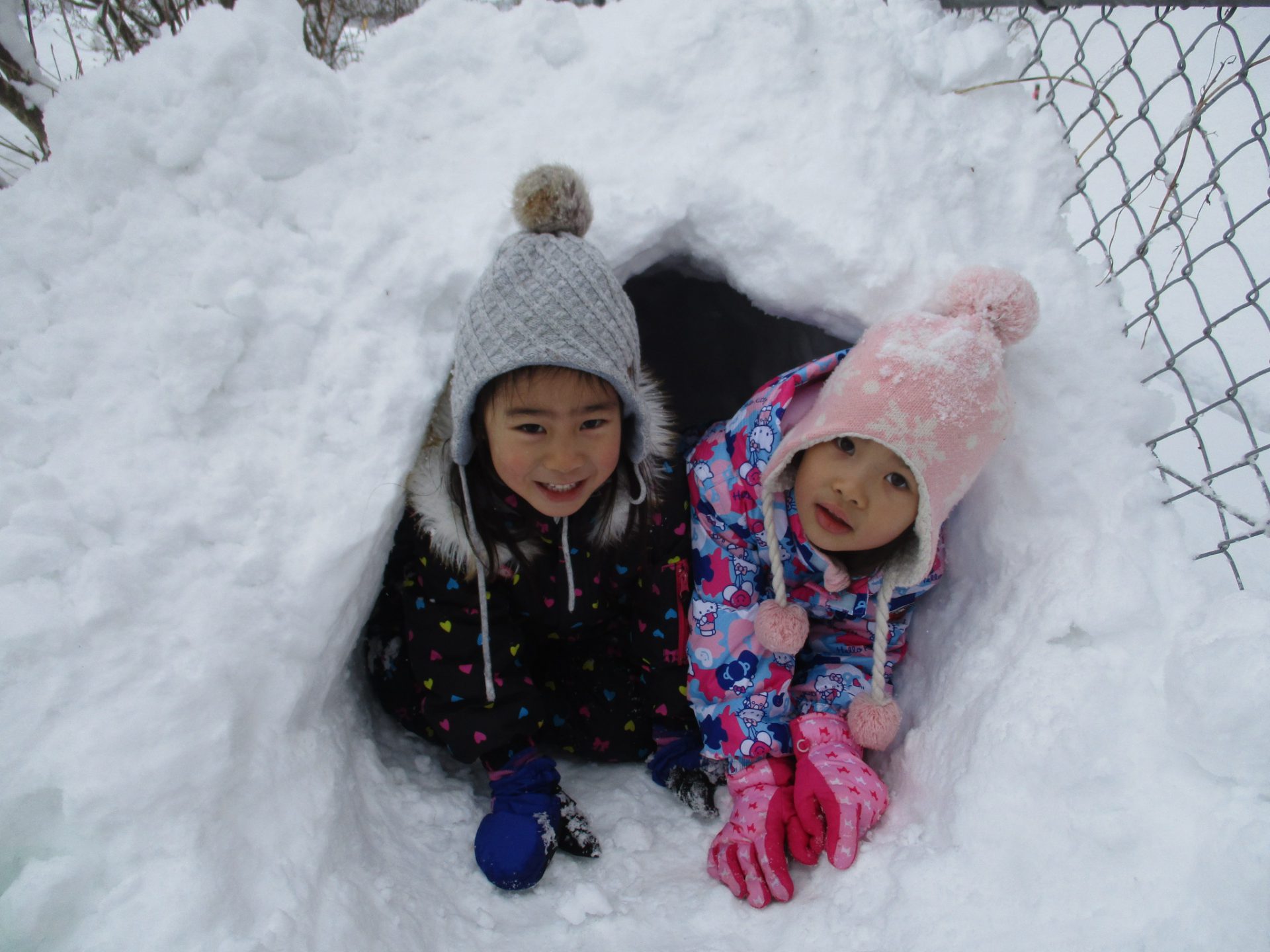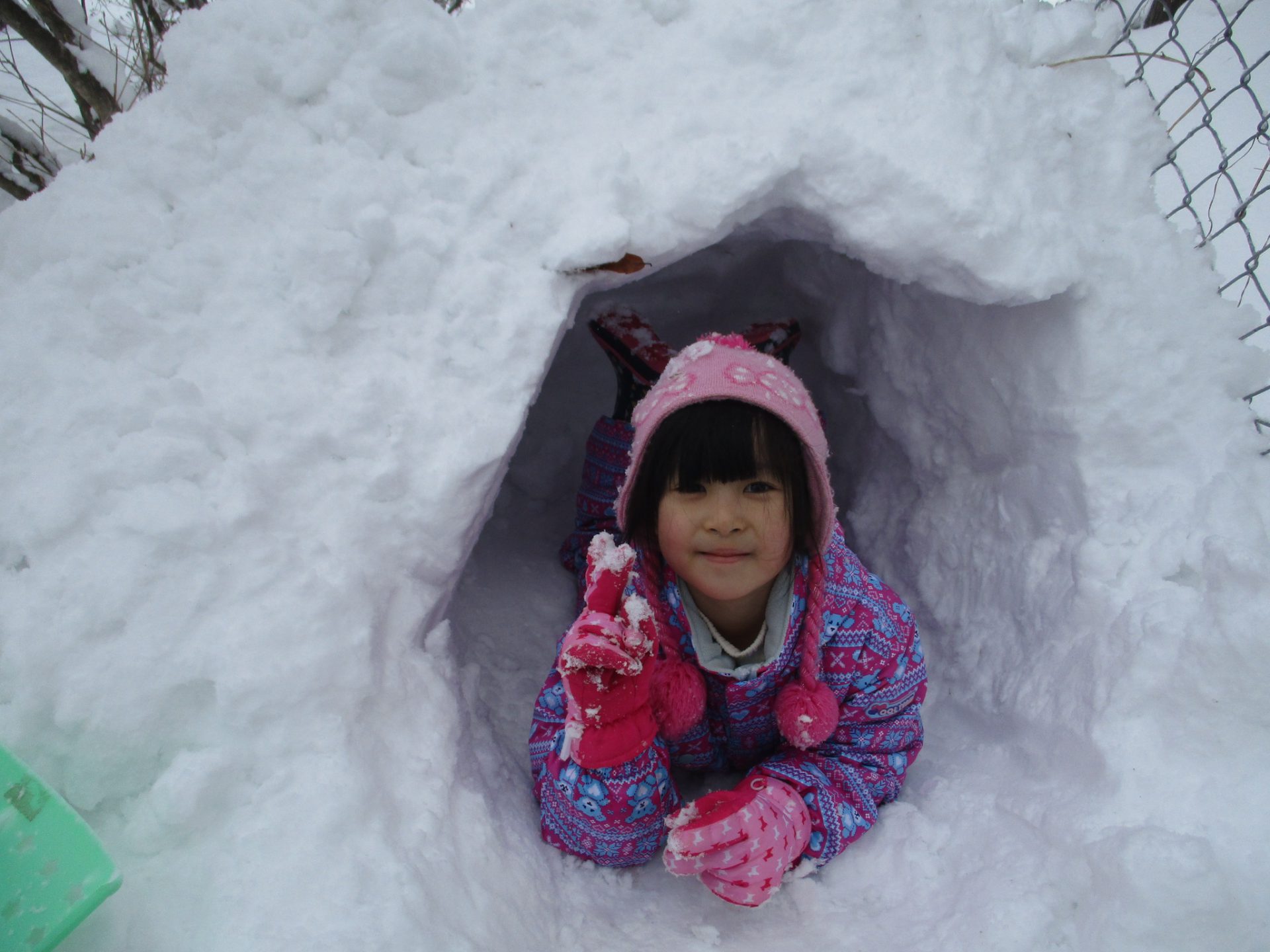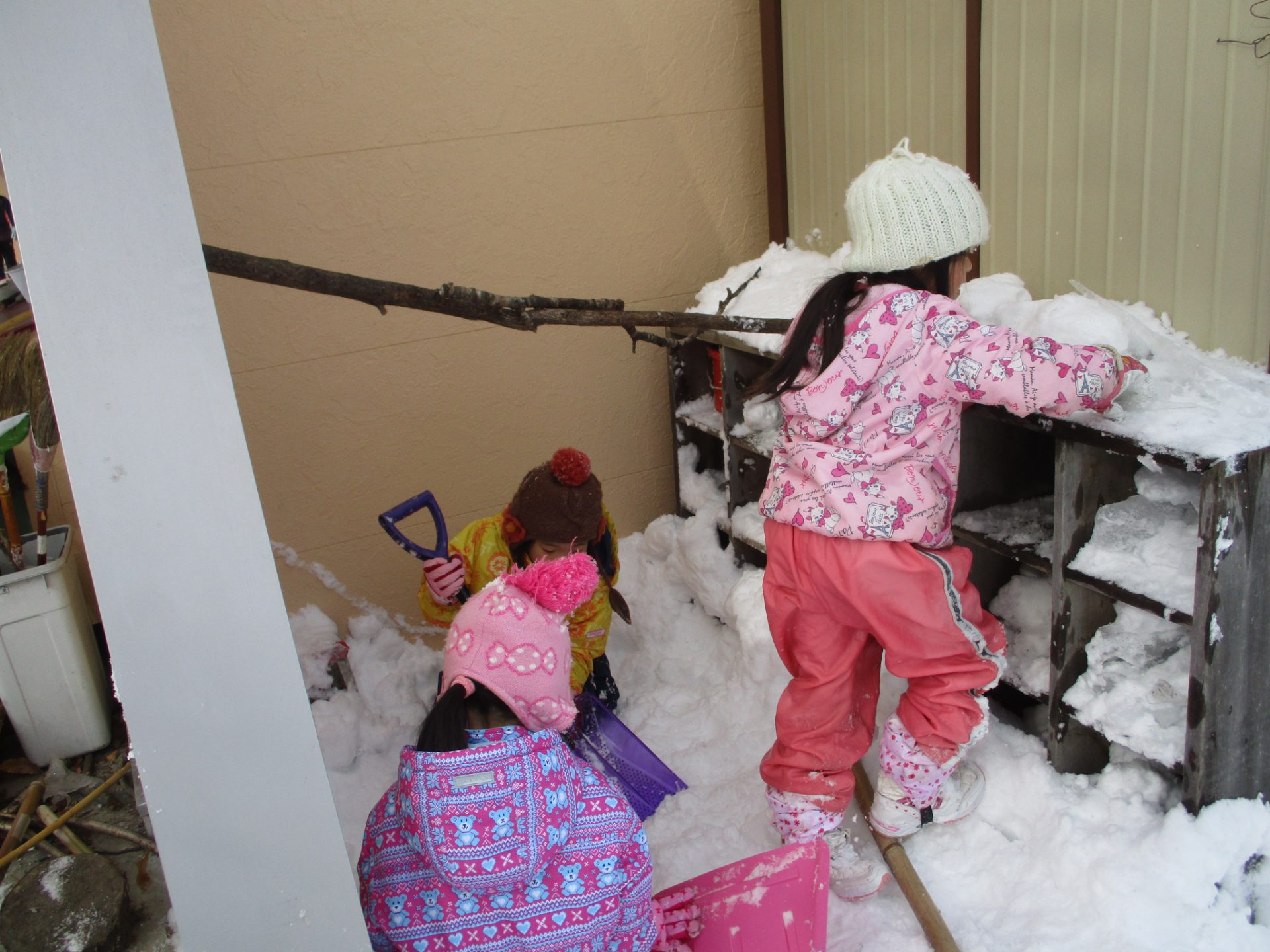 雪遊び、毎年楽しんでいますが、夏にも楽しんだ枝を使ってのお家作りや園庭のいろいろな場所で遊んだ経験など今までの積み重ねから発展していく遊びが多いことが、4、5歳児らしく、成長を感じます。