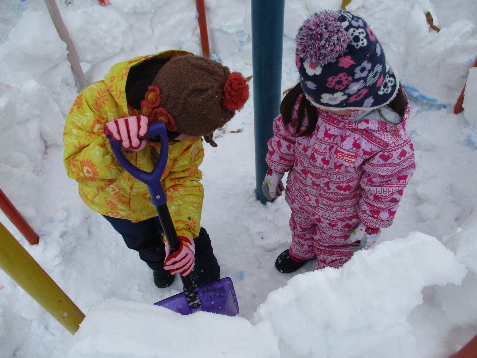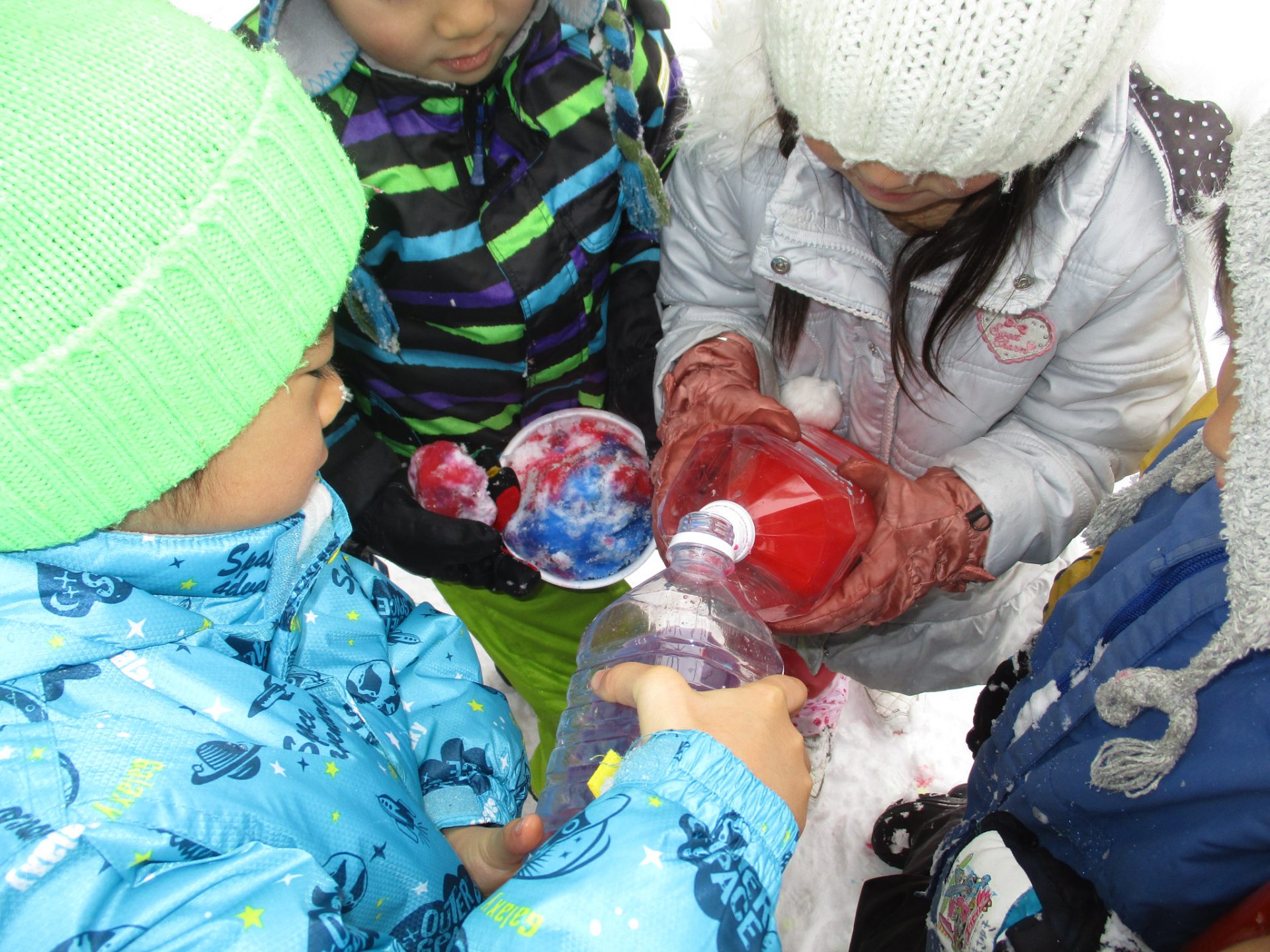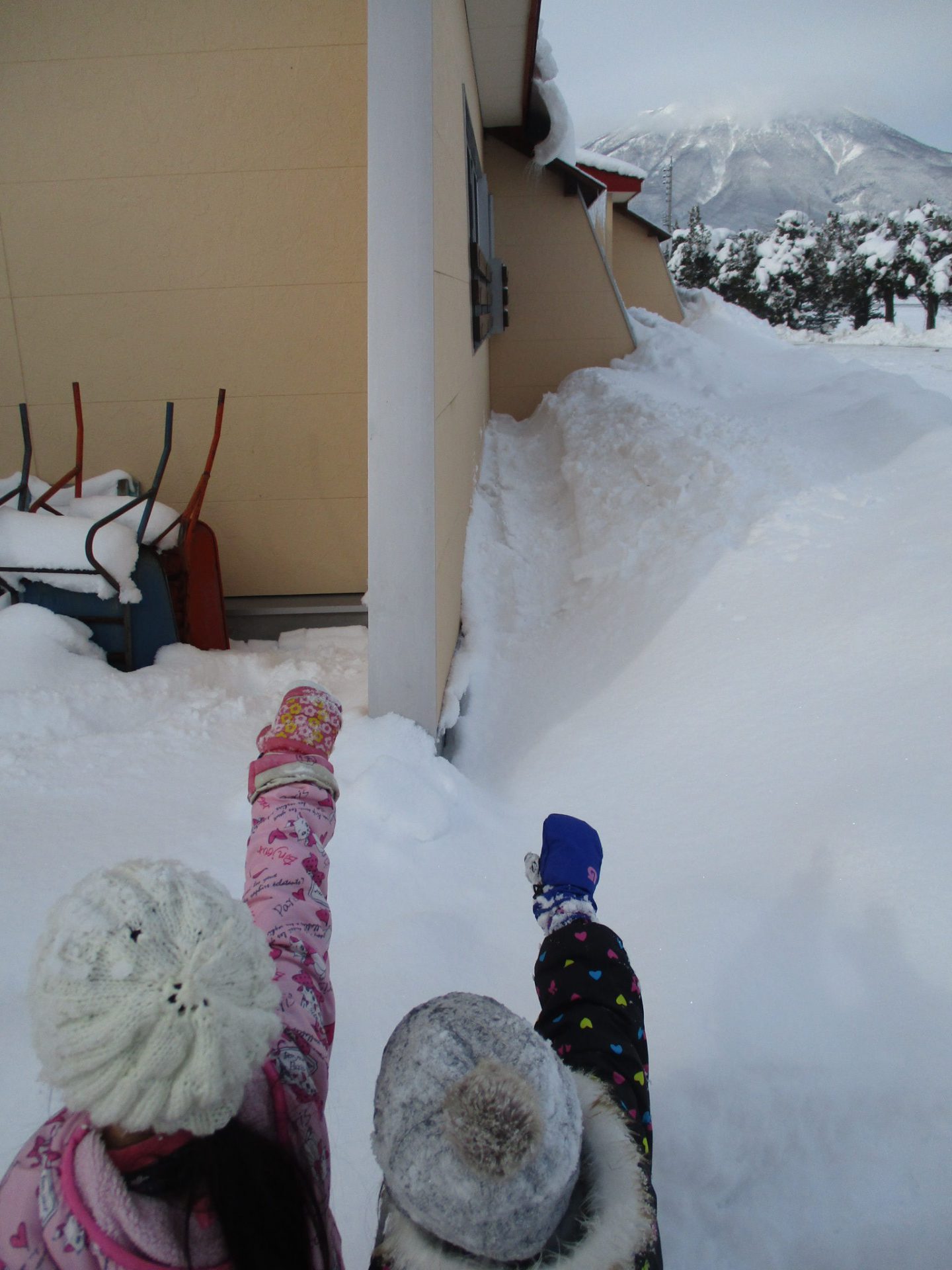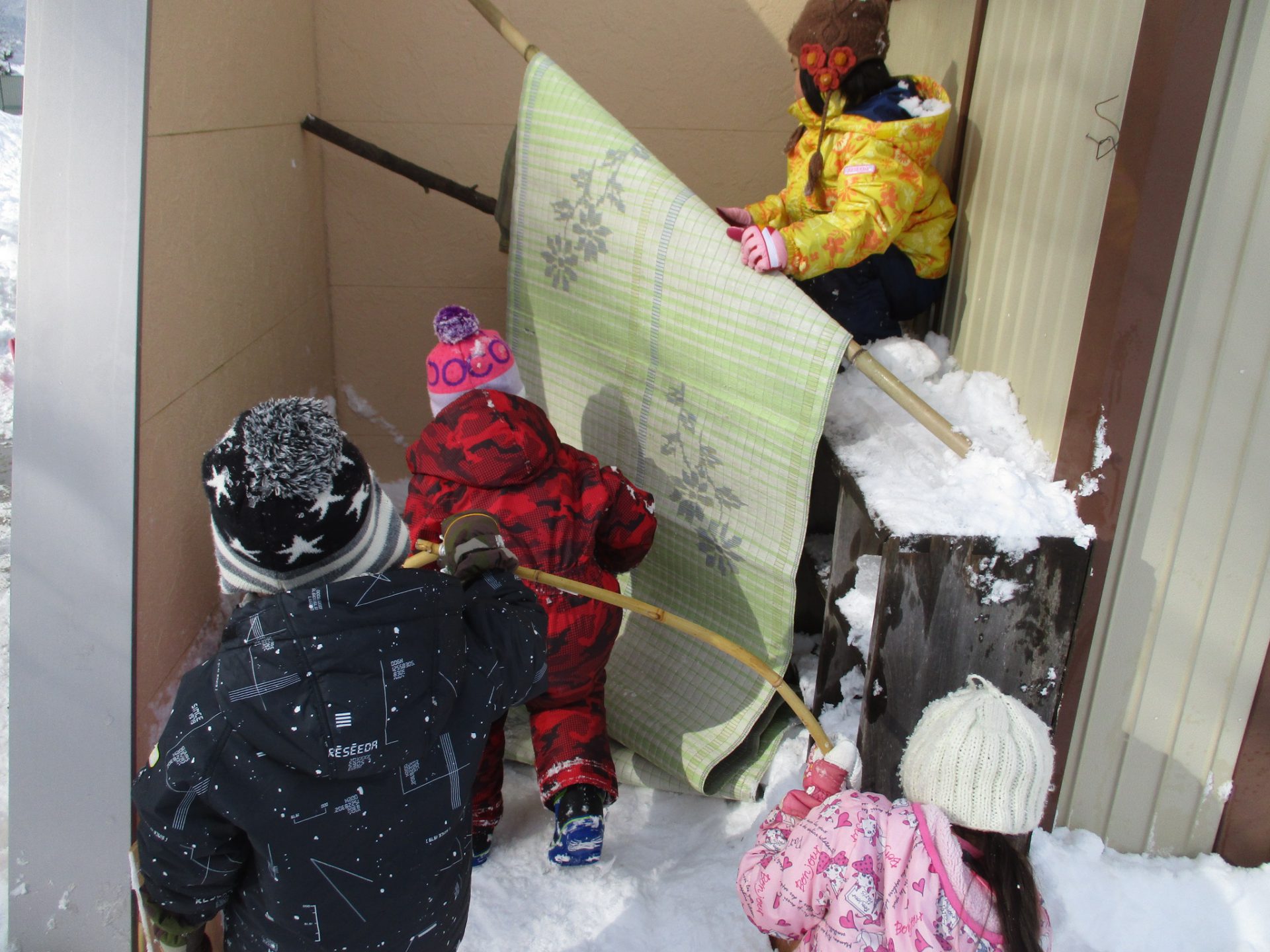 雪遊び、毎年楽しんでいますが、夏にも楽しんだ枝を使ってのお家作りや園庭のいろいろな場所で遊んだ経験など今までの積み重ねから発展していく遊びが多いことが、4、5歳児らしく、成長を感じます。