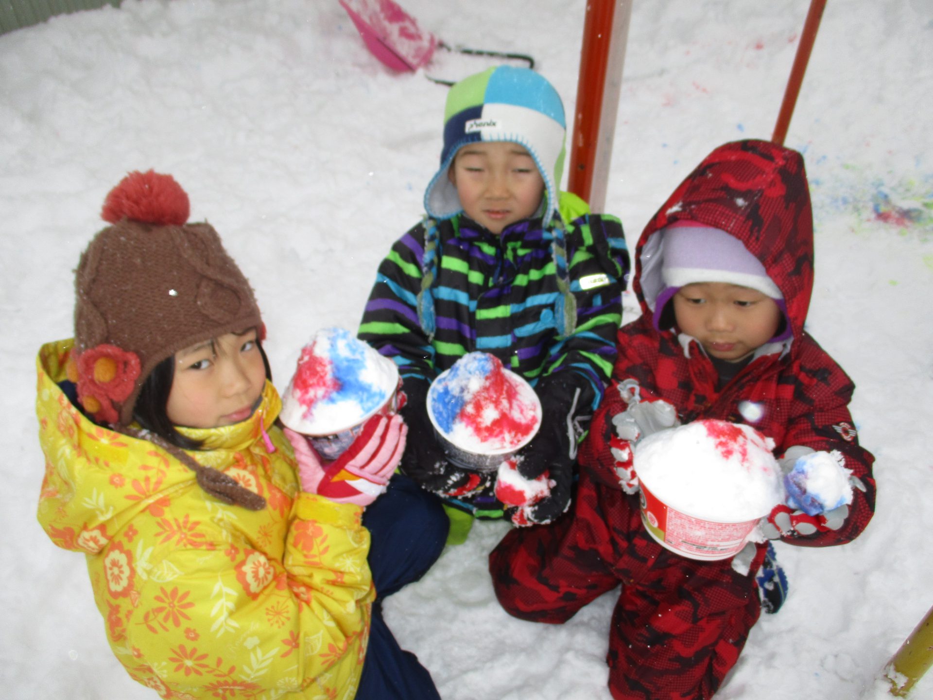お正月休み明け、待っていた雪が積もりました。園庭には小さな雪山もでき、はりきって外へ飛び出す子供達です。