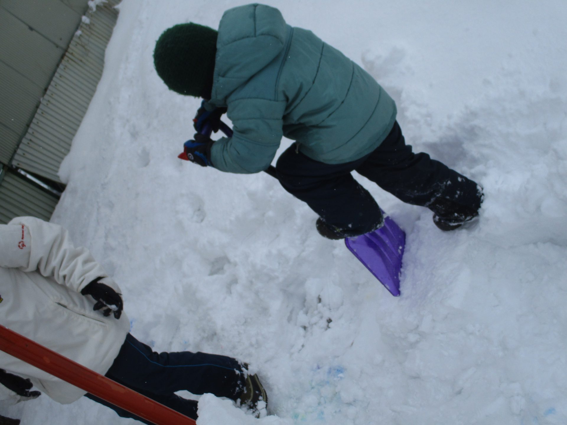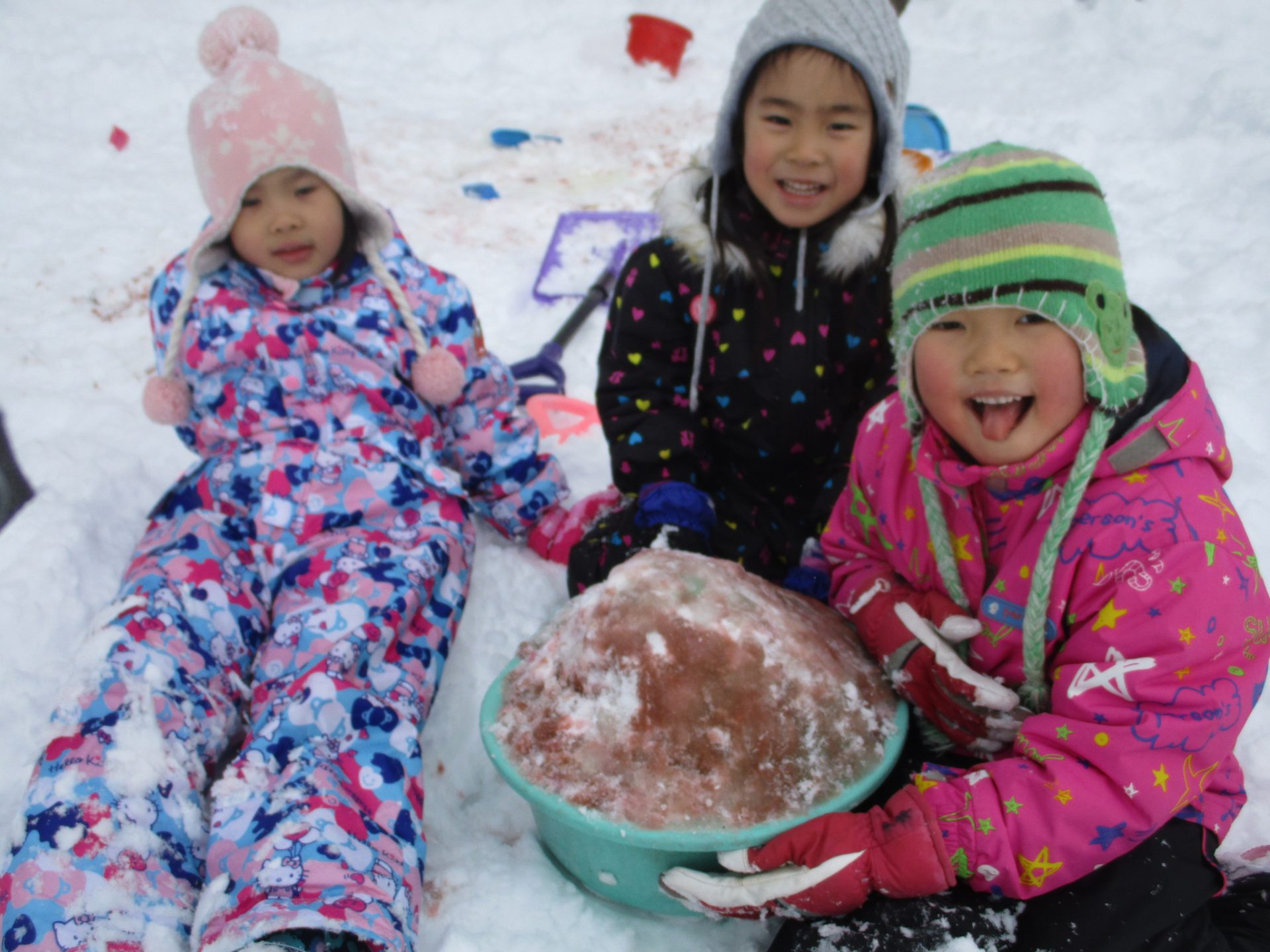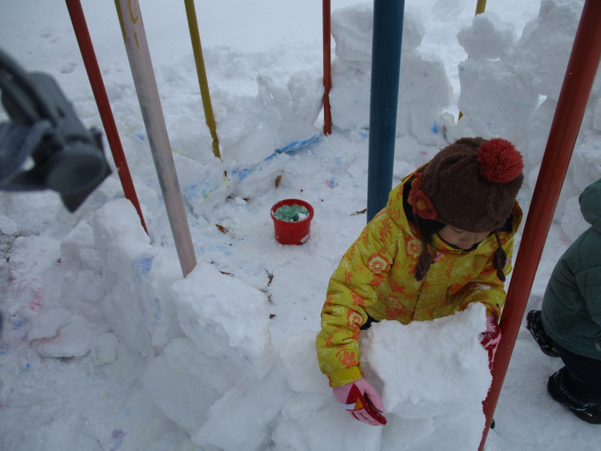 昨日までの雪が固まってスコップで掘るとブロックになることが分かり、積み上げてお家作り。色水がついて模様みたいになっている床がお気に入りだそうです。