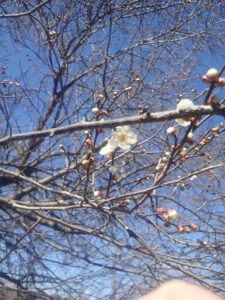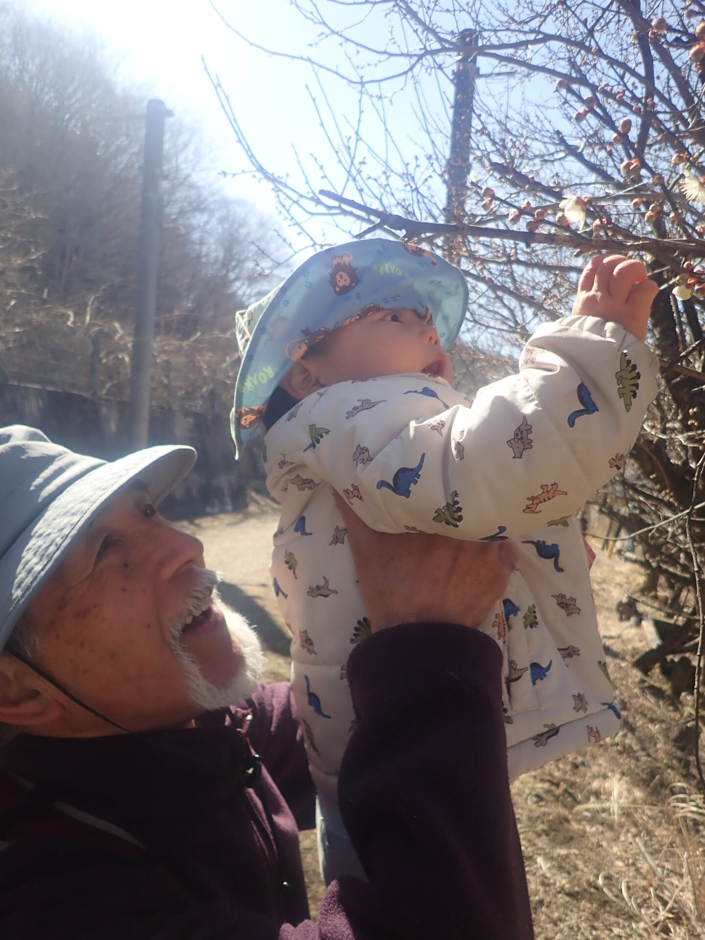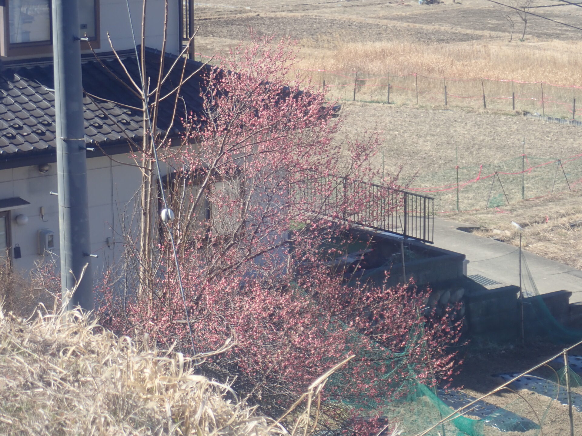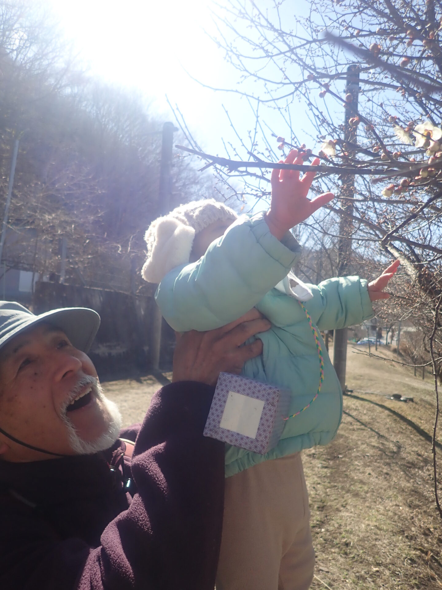 1歳児のT君が「ぴんくのはな!!」と廃線敷の麓にある家の庭先に咲いている梅の花を見つけました。