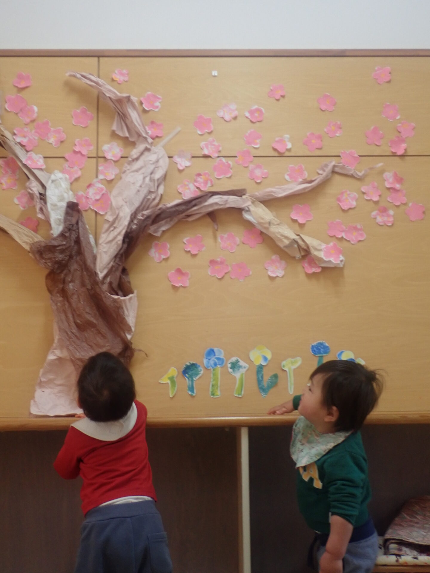 園に戻ってきた後、子どもたちは作った壁面の桃の花を見て「♪ぼんぼりに~ ♪つけましょ~」と自ら歌っています。