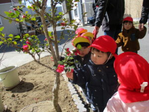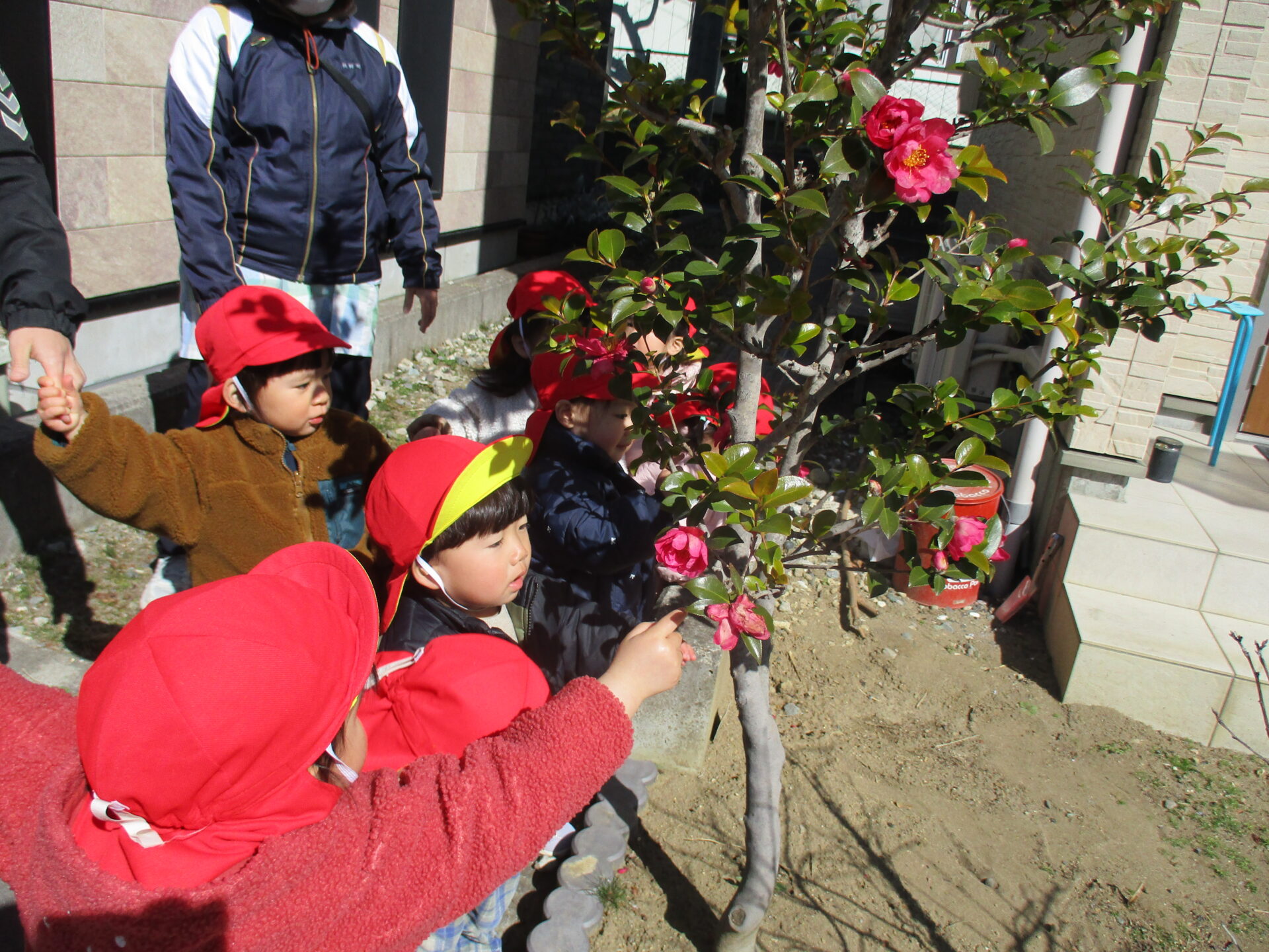 帰り道の途中、「おはなあった~!」と椿の花が咲いているのを発見!
