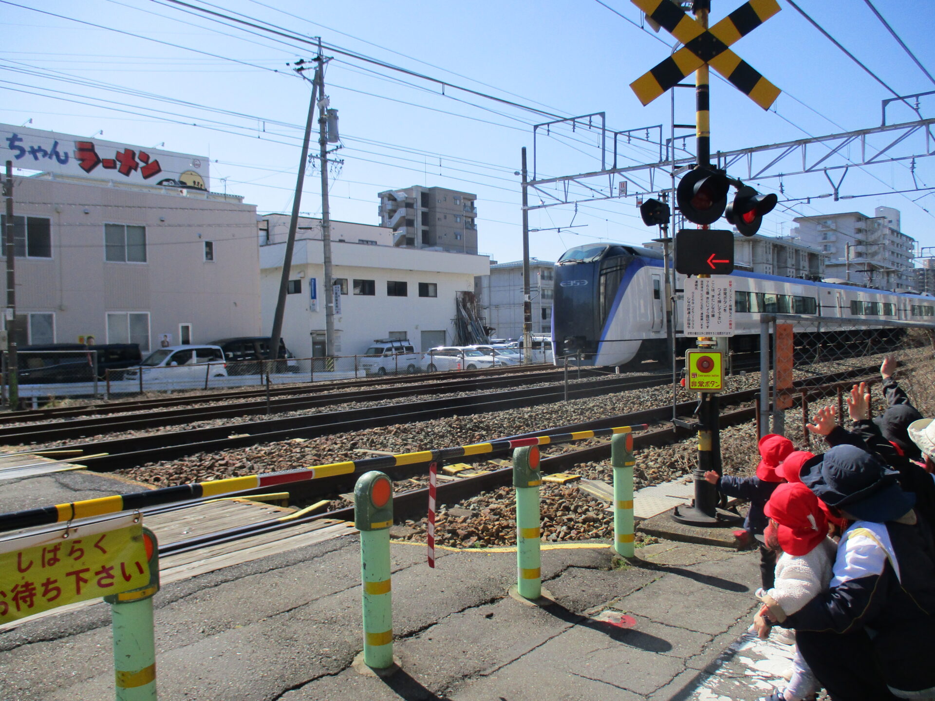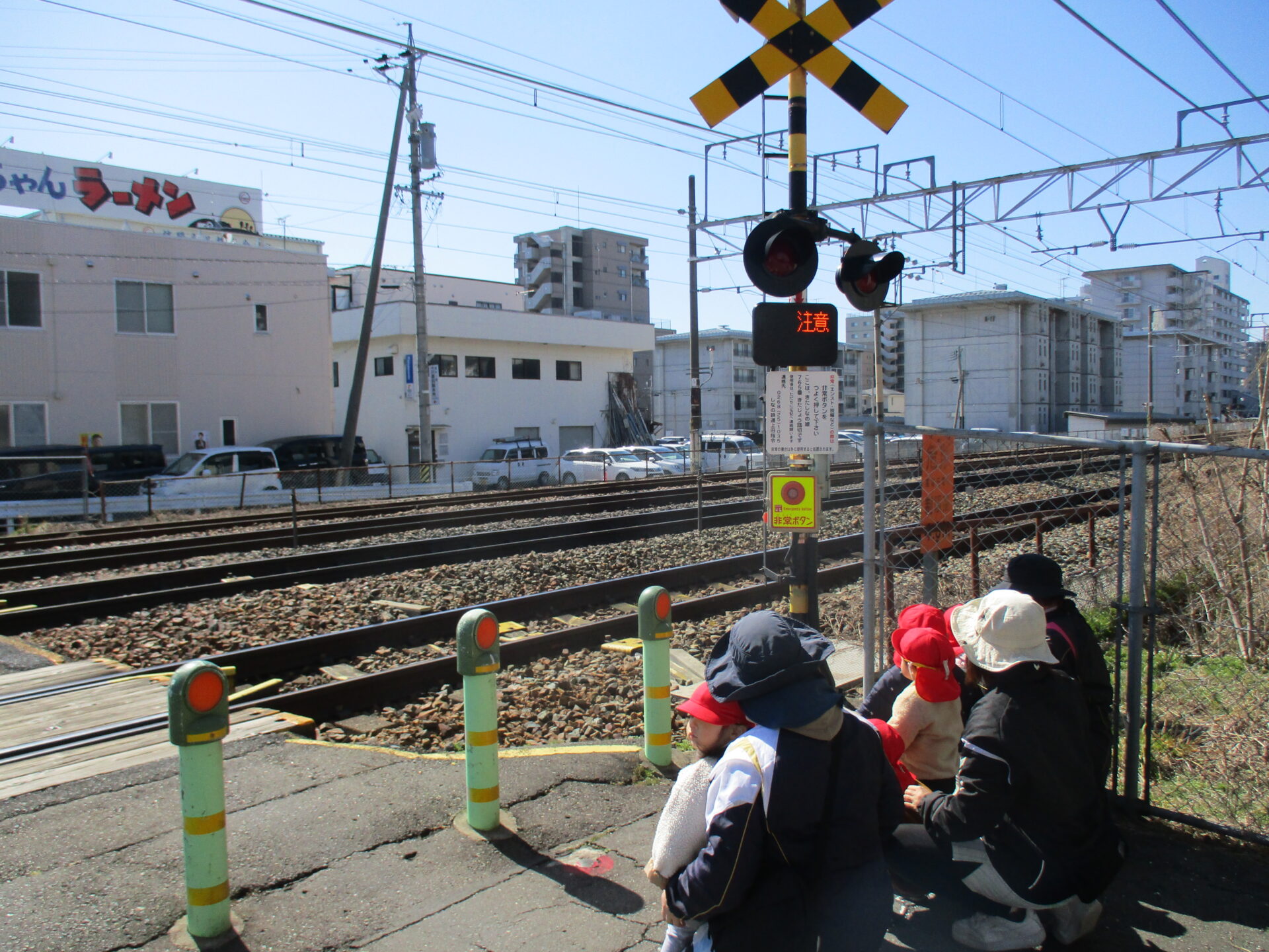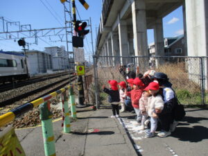 柳町保育園の近くには線路があり、電車が間近で見えるお散歩コースがあります。その中でも、踏切の遮断機が下がる様子を見ながら電車が見えるスポットが大好きな子どもたち。