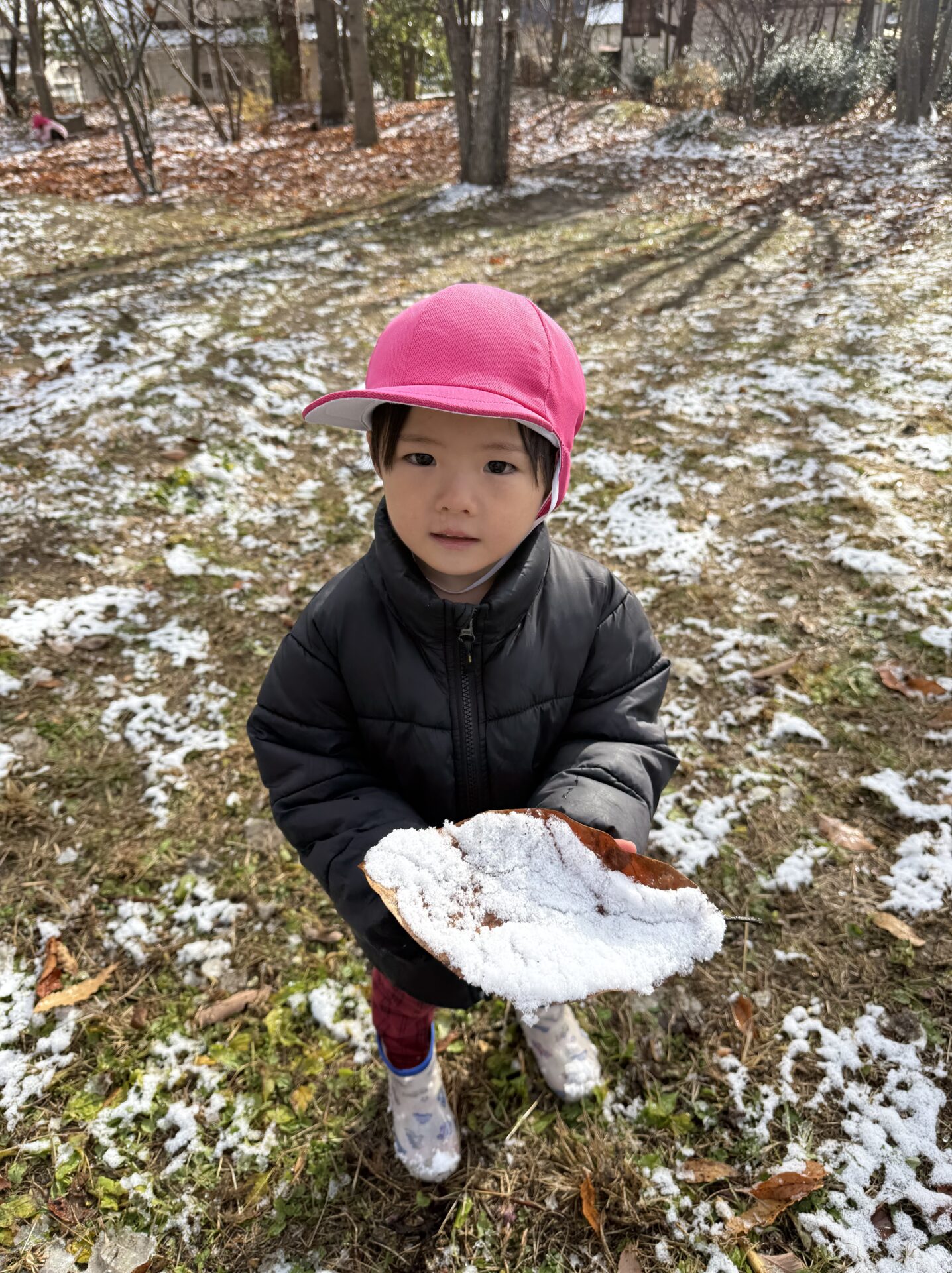 葉っぱの上にふんわりと雪が積もっている様子を見つけると、「はっぱのおさらだよ~!」と嬉しそうに見せてくれました。