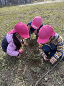 あおきっこ広場での豊かな自然の中でのびのびと遊ぶことを通して、発見する楽しさや季節の変化を感じながら過ごしている年少さん。