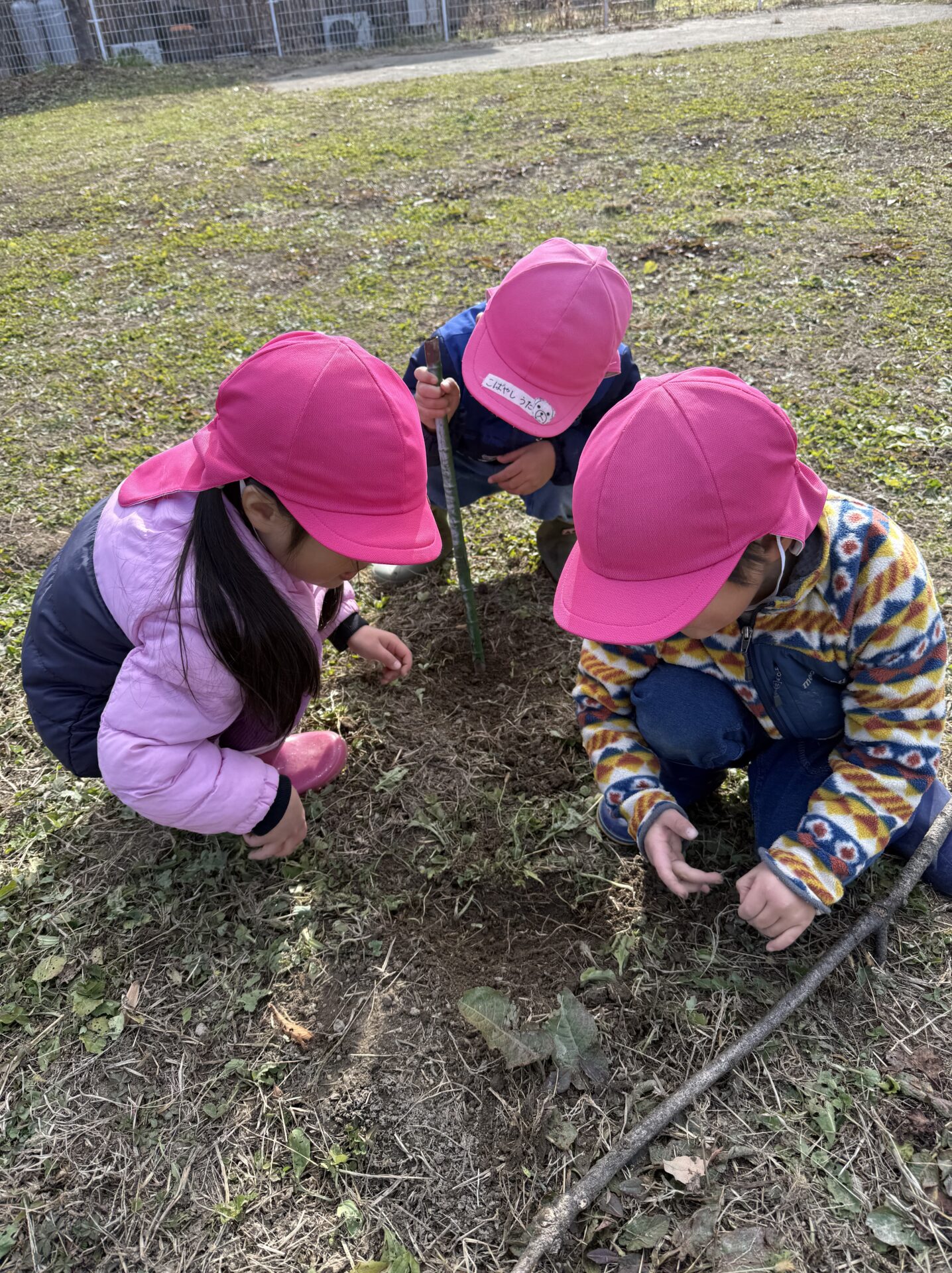 実を見つけた子どもたちは、一生懸命あなを掘って植えていました。