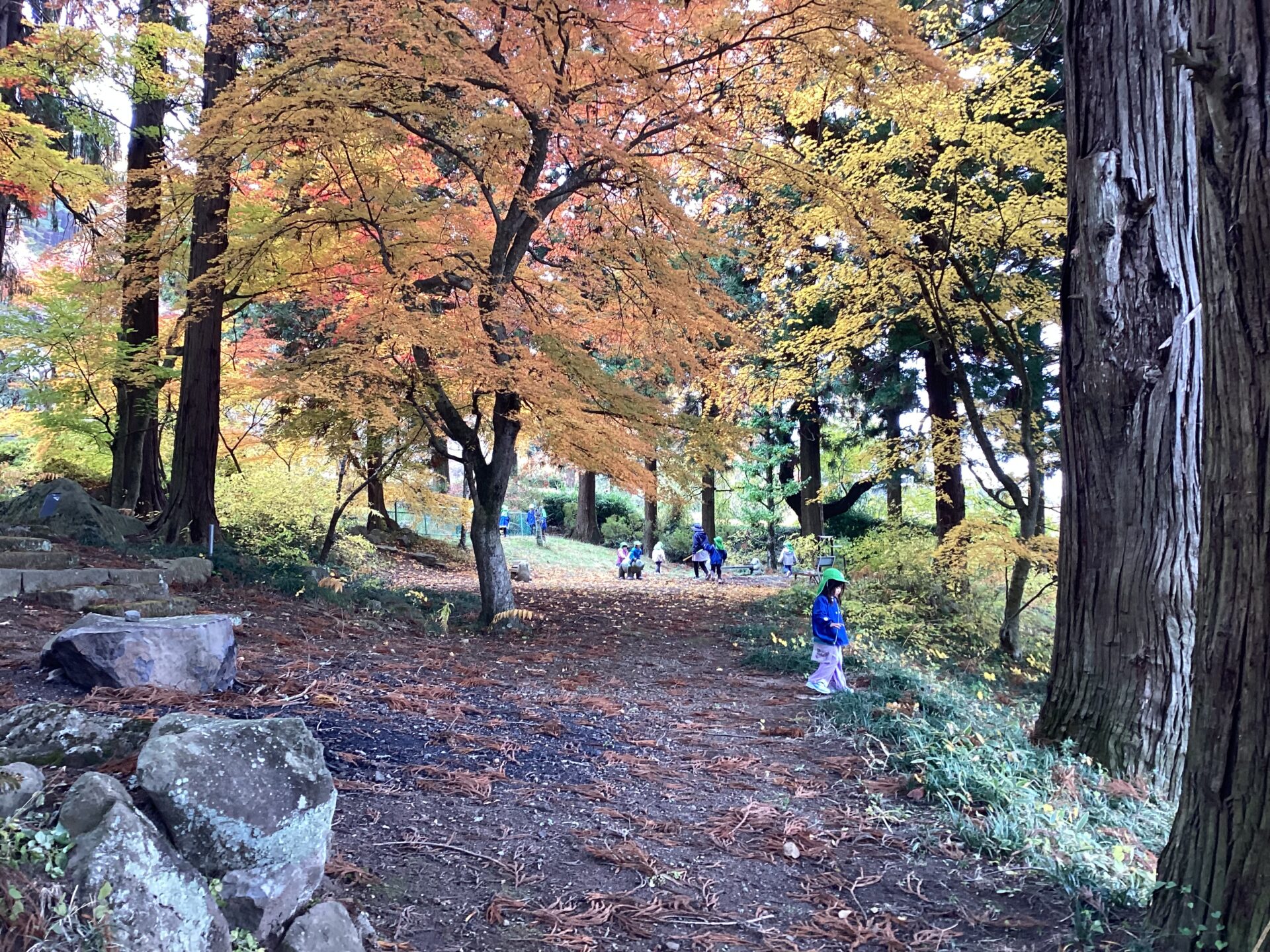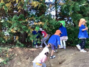 園外に散歩へ出かけることで、園内にはない虫や花などを見つけたり、触れたりすることができとても喜んでいました。また、何度か出掛けているうちに葉っぱの色が変わっていることに気がついたり、今までより多くのどんぐりが落ちている事に気がつくなど自然の変化に気がつく姿もたくさんありました。園外の自然に触れながらのびのびと遊ぶ中で、子どもたちの気づきや発見の喜びを共有しながらこれからも散歩を楽しんで行きたいです。
