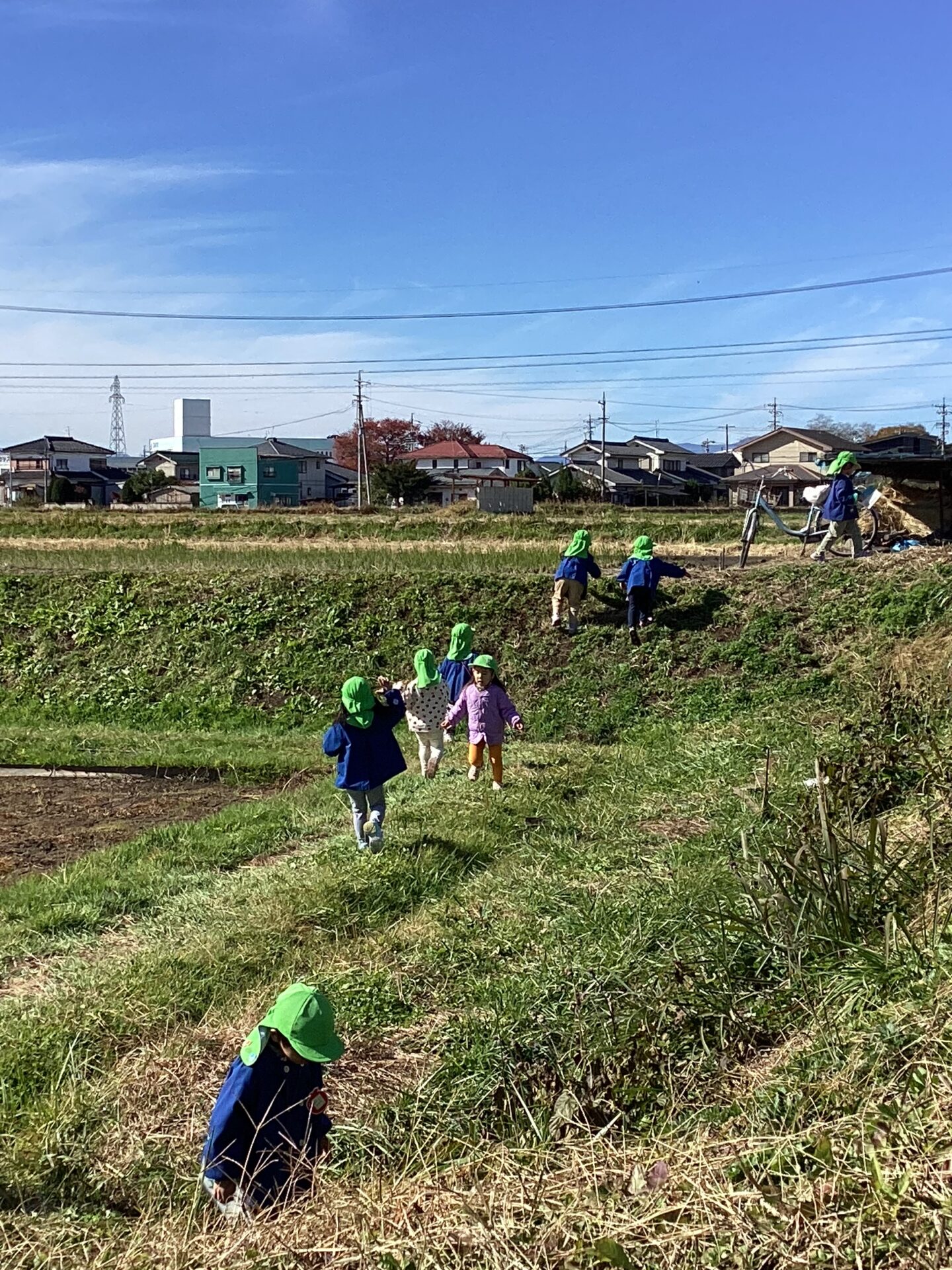 園から近い田んぼでは土手を登ったり走ったりを繰り返し、ミニマラソン大会が開催されます。少し急な坂にも挑戦する子どもたち。田んぼから帰る頃にはほとんどの子のズボンがどろんこです!