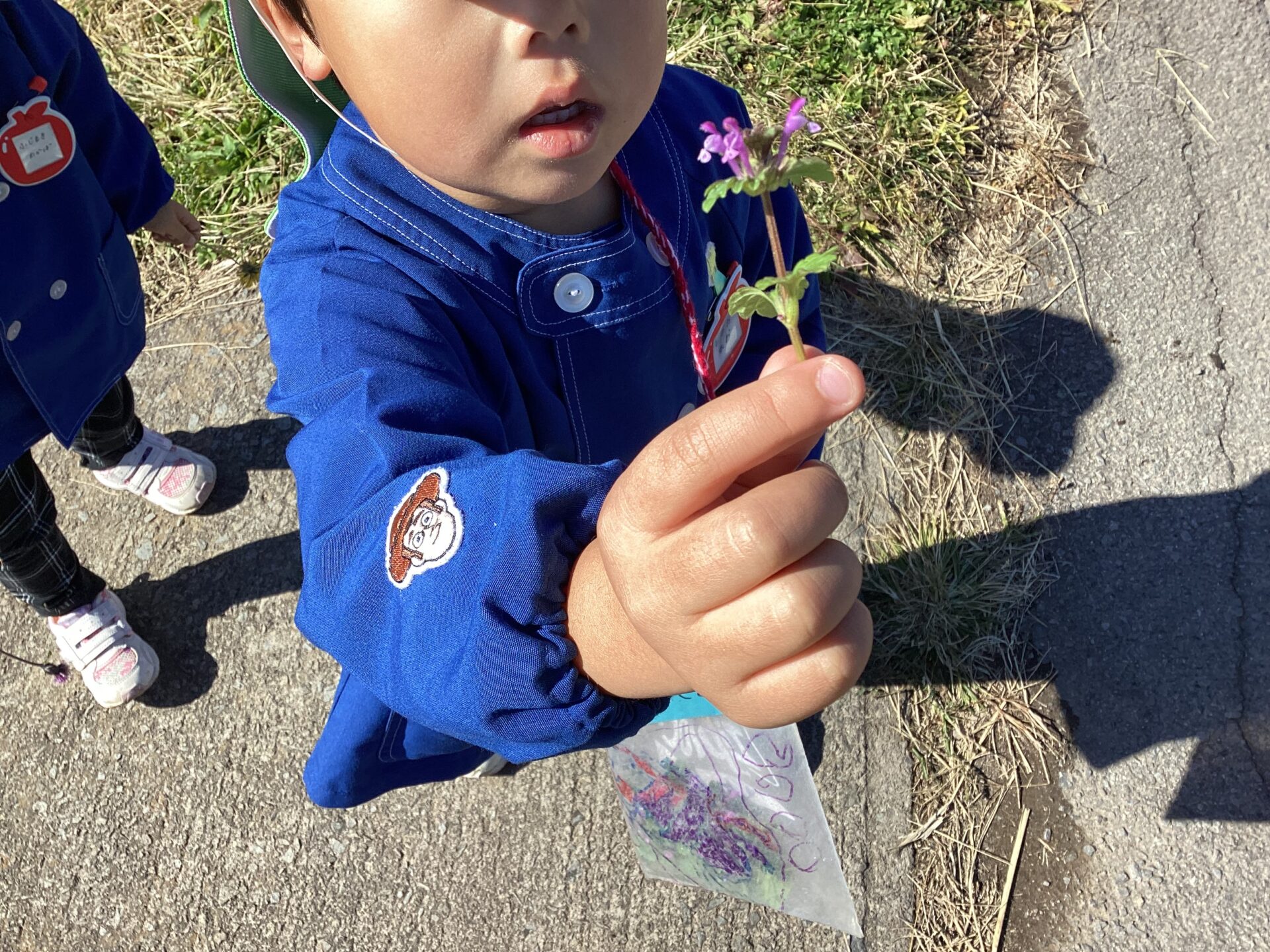 土手には季節の花がたくさん咲いていて花や草を大切にお散歩バックに入れて持ち帰っていました。虫もたくさん見つけ「こっちにもいる!」と共有しながら観察したり触れてみたり…