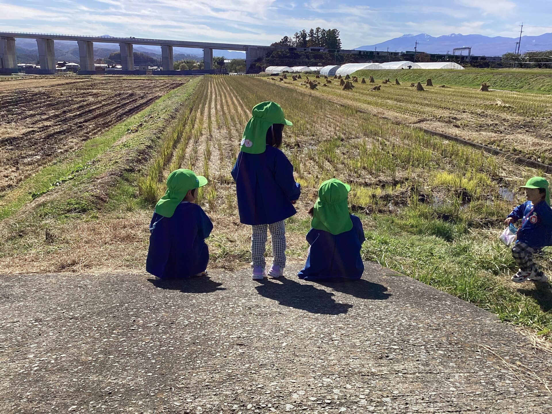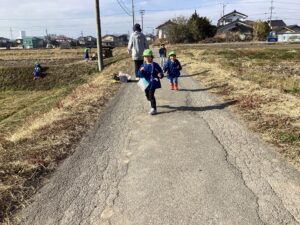 お散歩がだいすきな子どもたちは天気のいい日には田んぼや神社、公園などにたくさんお散歩へ出掛けています。