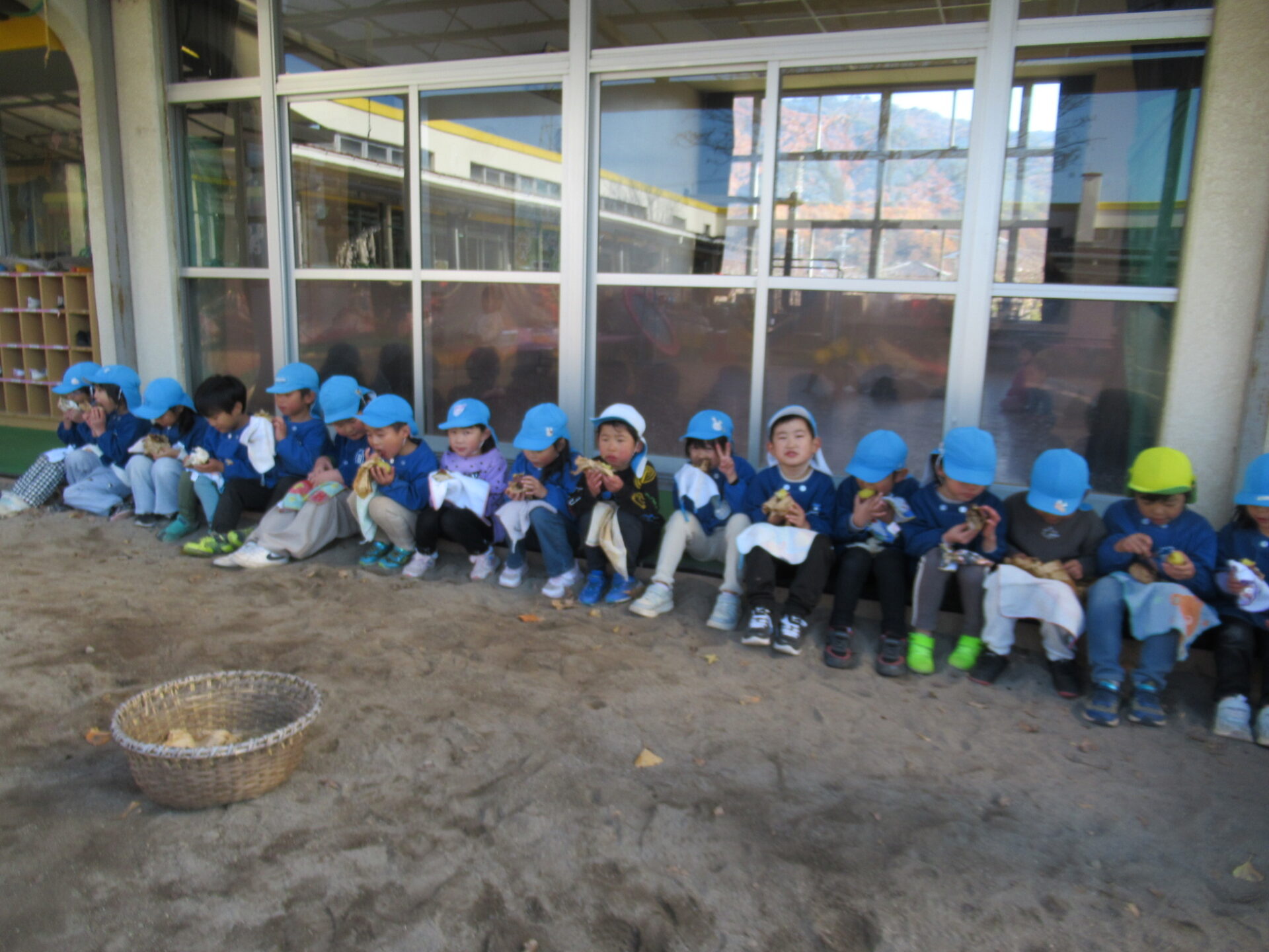 できたお芋は以上児クラスさんはお庭で食べできたてホクホクを楽しみました。