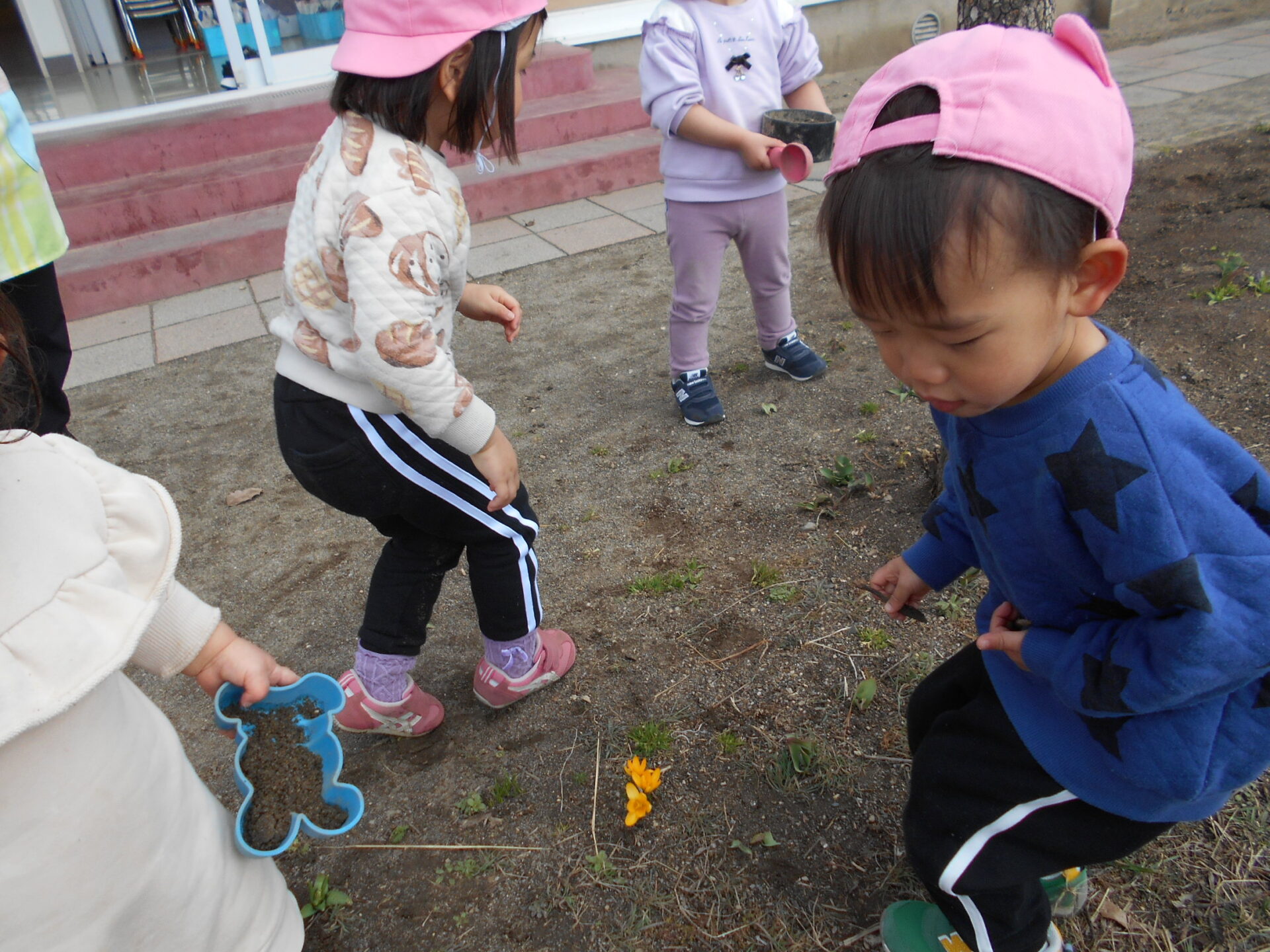 保育士の「お花が咲いてるよ」の声に集まってきた子どもたち。