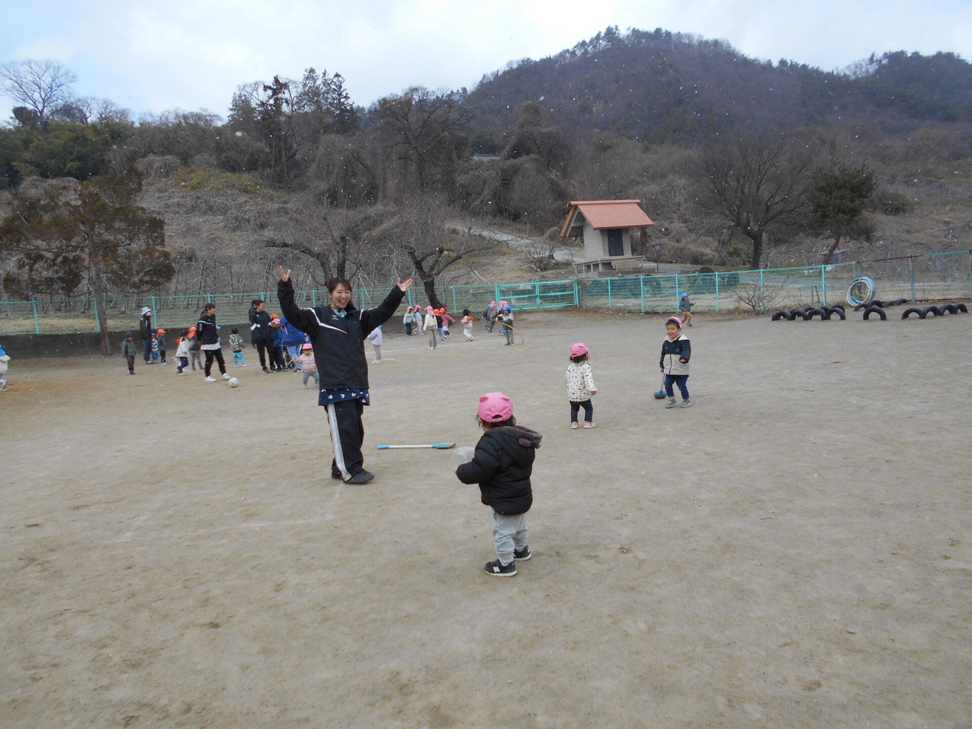 また冬に逆戻り。寒さに負けず園庭で遊んでいると、雪が舞ってきました。