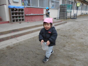 舞っている雪を拾ったペットボトルで集めようとしていました!