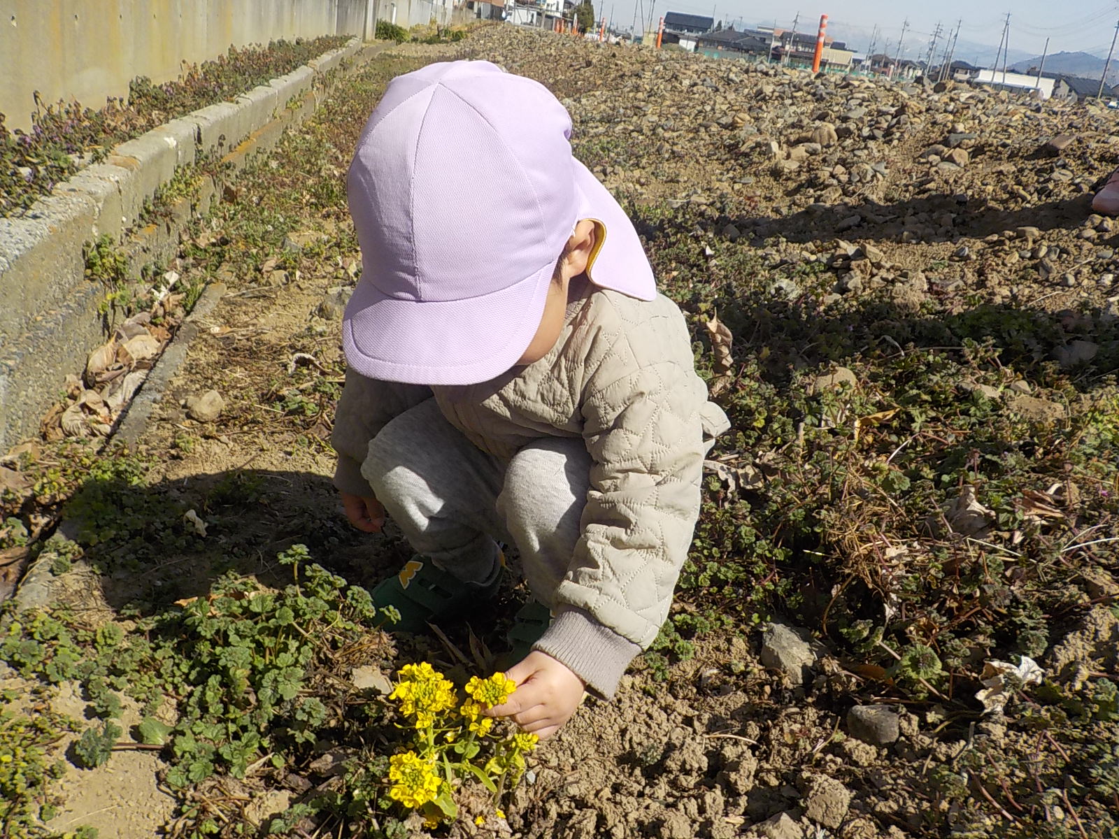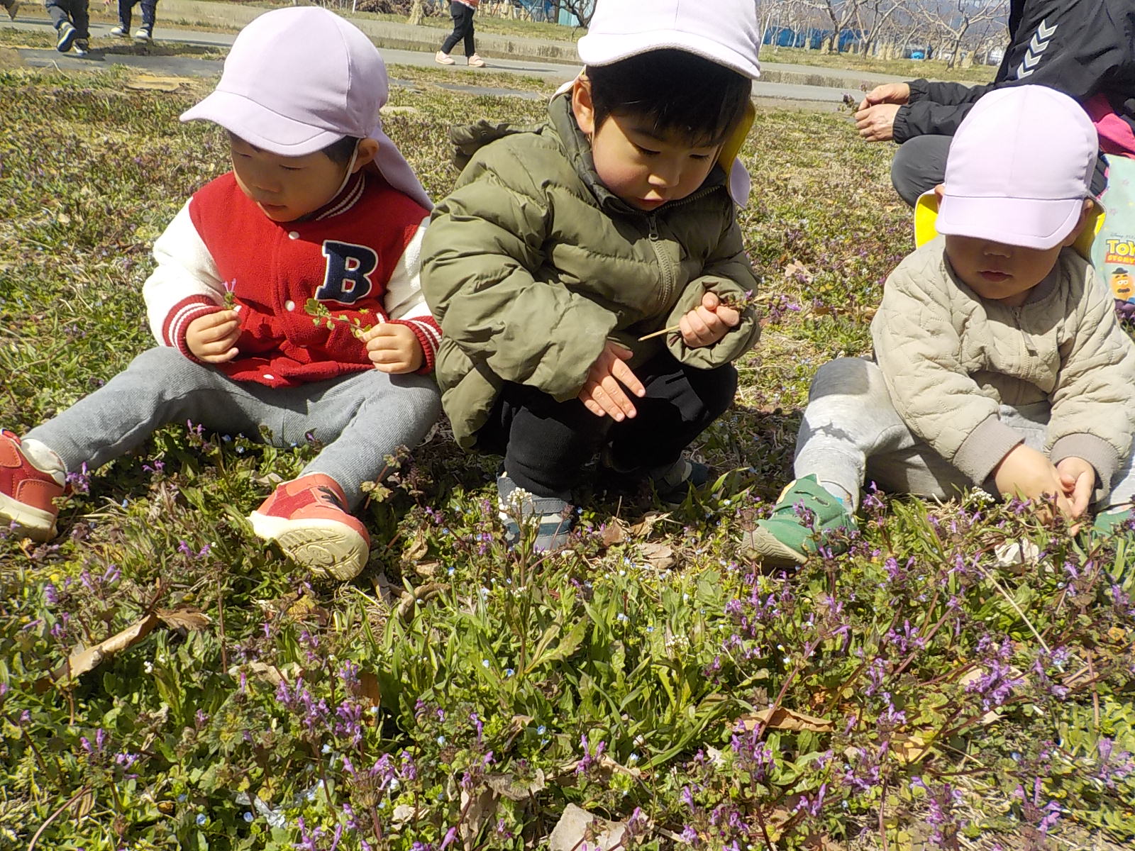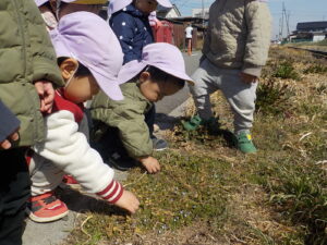 「おおいぬのふぐり、だね」「ほとけのざ、だね」保育士が名前を言うと