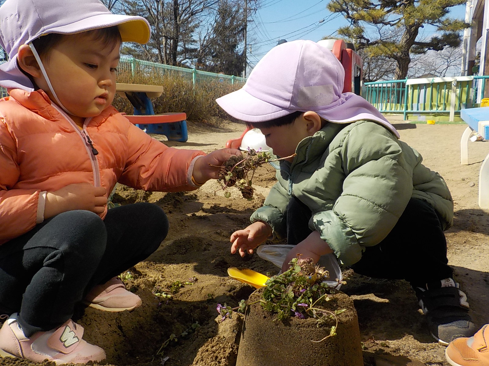 散歩で見つけた花を摘んで帰った子どもたちが、砂遊びで摘んだ花を使ってケーキを作り始めました。