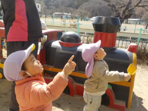 「あ!かぜだねぇ」といった後に「はるのかぜがぁふいてきたらぁ・・・」と歌をうたう子もいました。