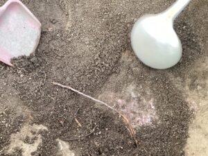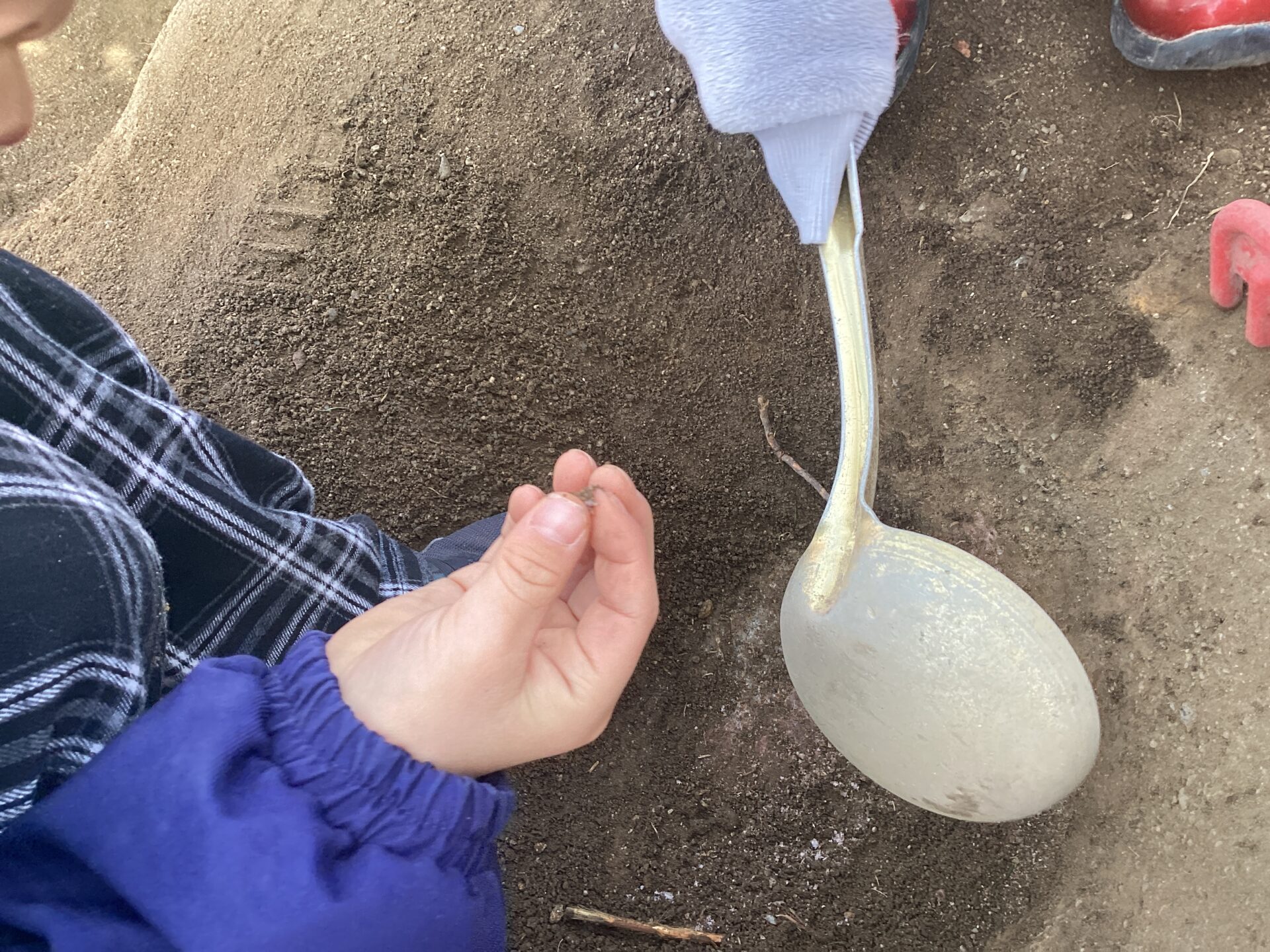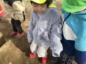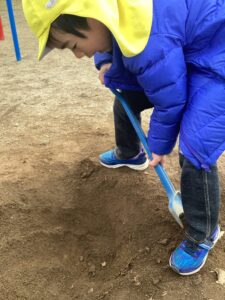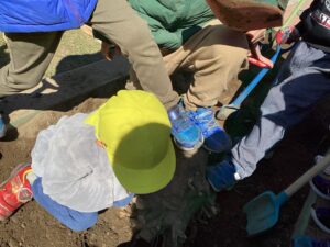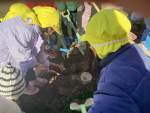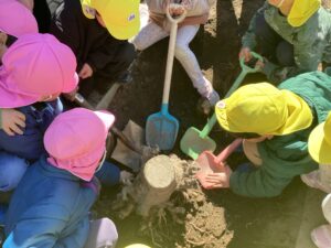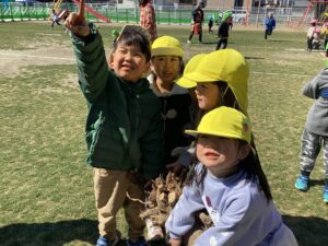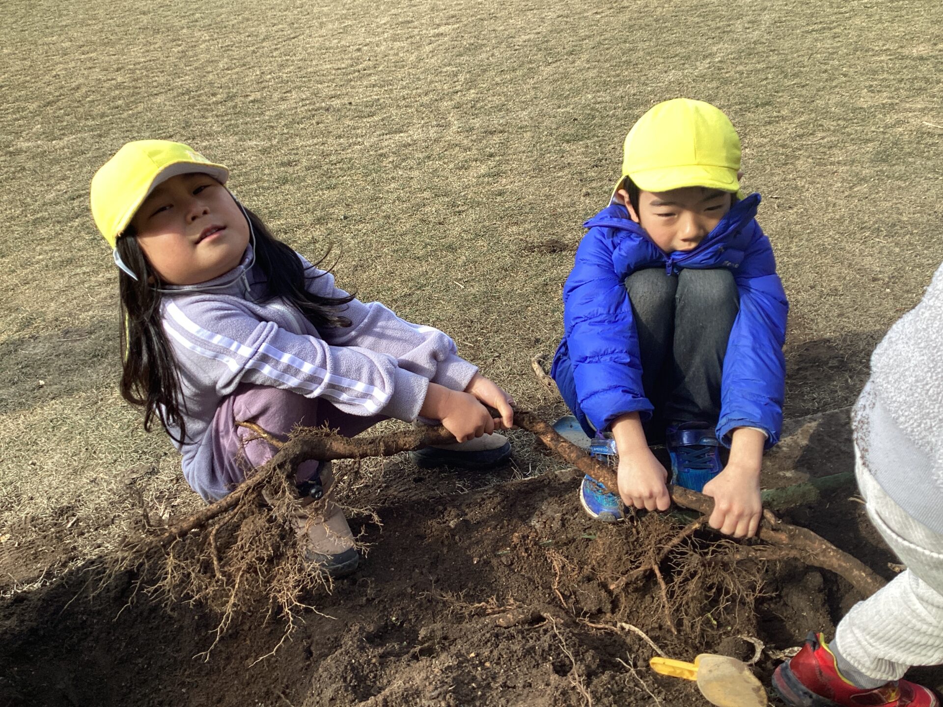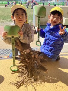 夢中になって続ける姿、土を掘っていく中での疑問や気づき、この活動の経験から、自分たちで考えたおはなし遊び、そして、最後に根っこを掘り出し満足出来た子どもたち。