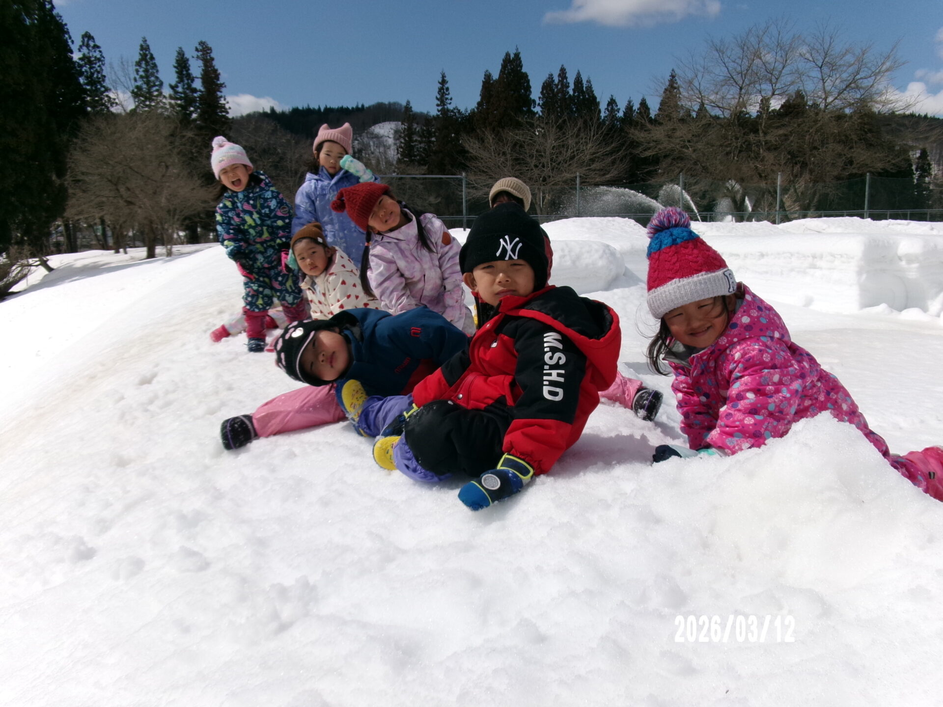 「私たちは ここですよ~!」「あ、見つかっちゃう!隠れよう」 雪を使って いろいろな遊びを考えて楽しみます。
