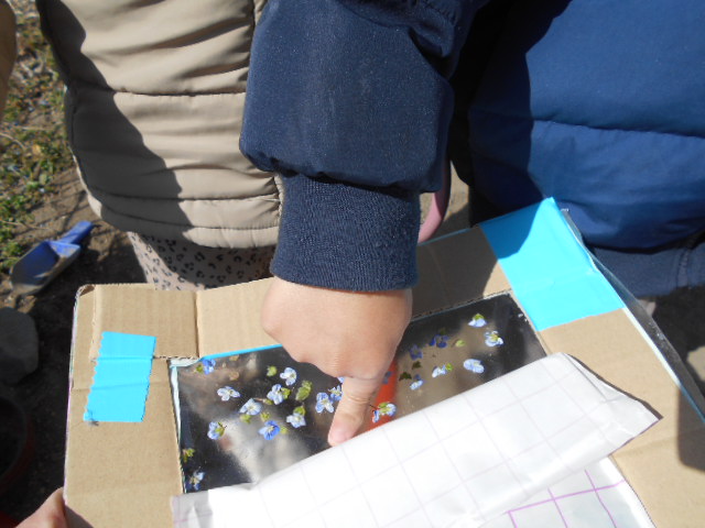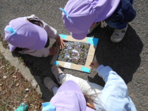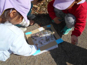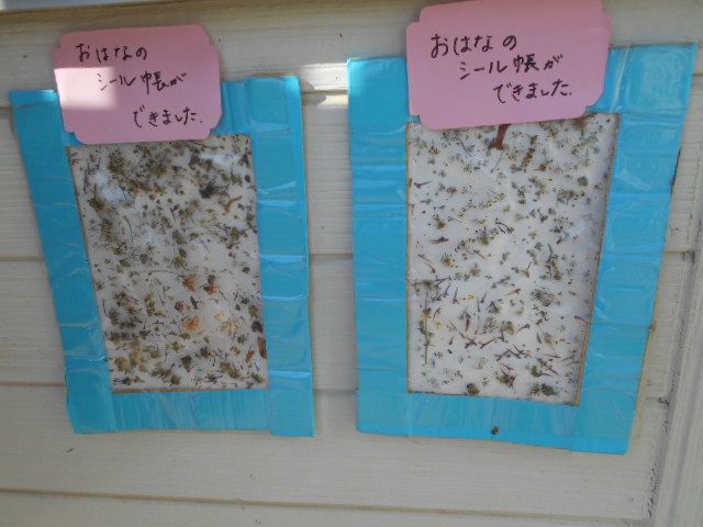 ・小さいお花は手に取ると崩れてしまうが、粘着シートを用意することで、形をそのまま残しておうちの方へ見せることができた。家庭へ配布は出来ないが送迎時に親子の会話が出来て更に興味が広がっていくことができた。