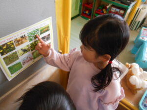 ・春になり、いつも行く散歩先にいろんな色の小さいお花があって、なんていう名前か興味を持ってもらいたく、ポケット図鑑をみえるところに置いた。そこから花の名前を聞いてきて、周りの子へも伝え、覚え興味を持つことができた。
