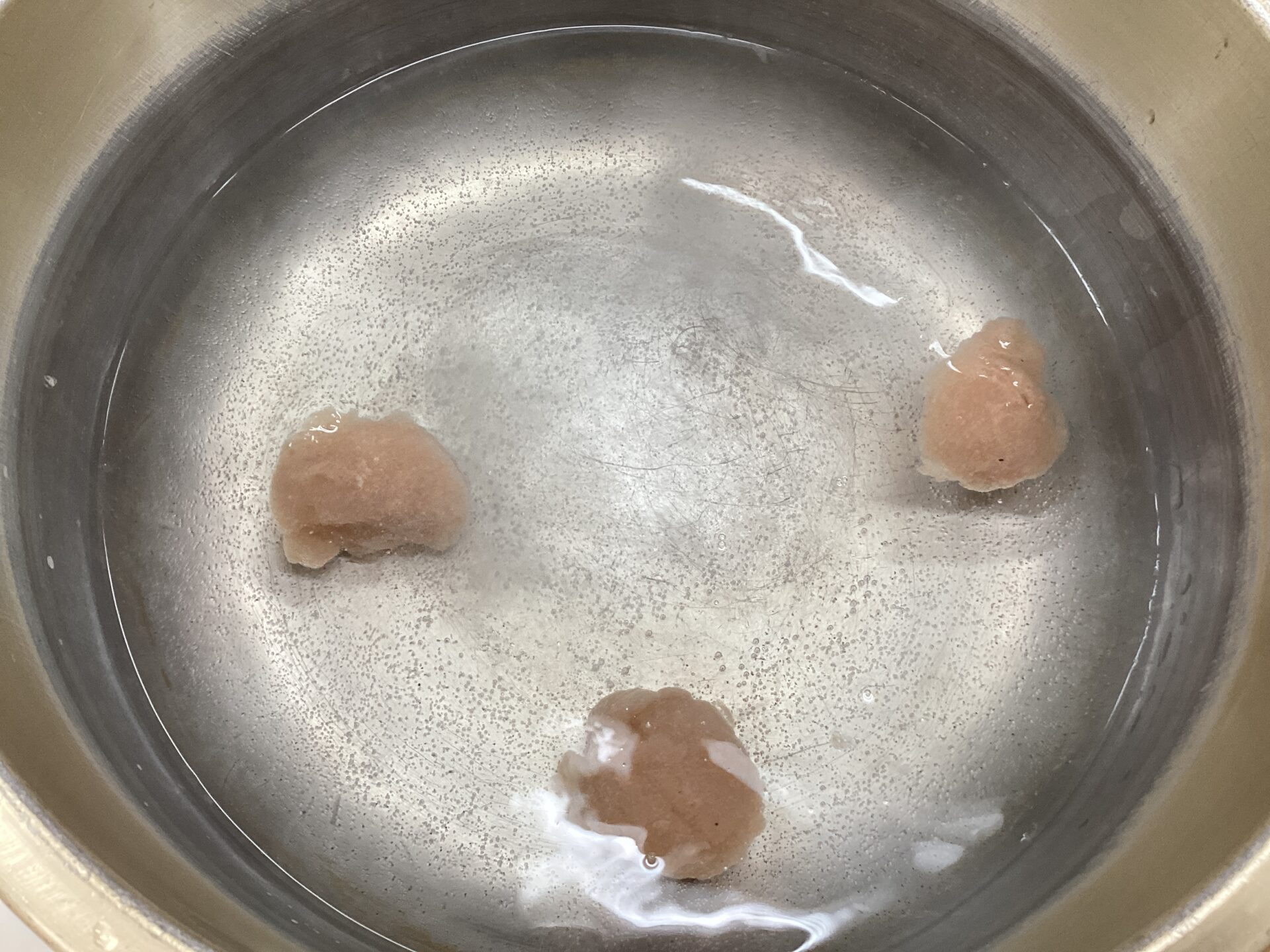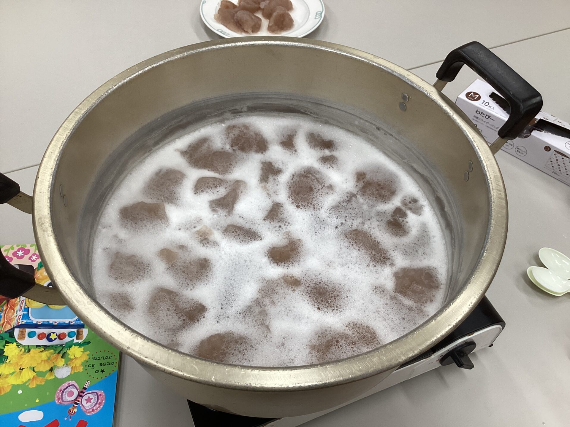 少しずつ固まってきたこんにゃくを鍋で茹でます。