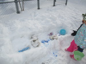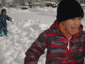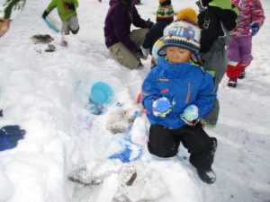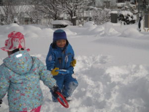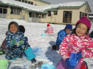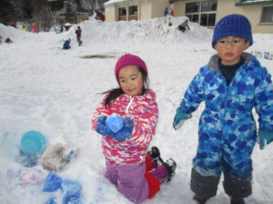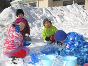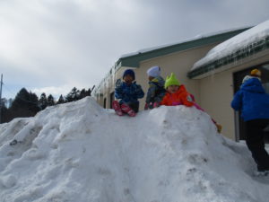 毎日のように雪で遊ぶ子どもたち。給食の時間になるまでたっぷり遊び尽くしています。ジャンバーを脱いで、給食の準備をしながら「明日も、今日の続きしよ」「明日は負けないからね」とまた、雪で遊ぶのを楽しみにしています。まだ今年の雪遊びは始まってばかり。どんどん活動を展開していきながら、信濃町の冬ならではの遊びを存分に楽しみたいと思います。