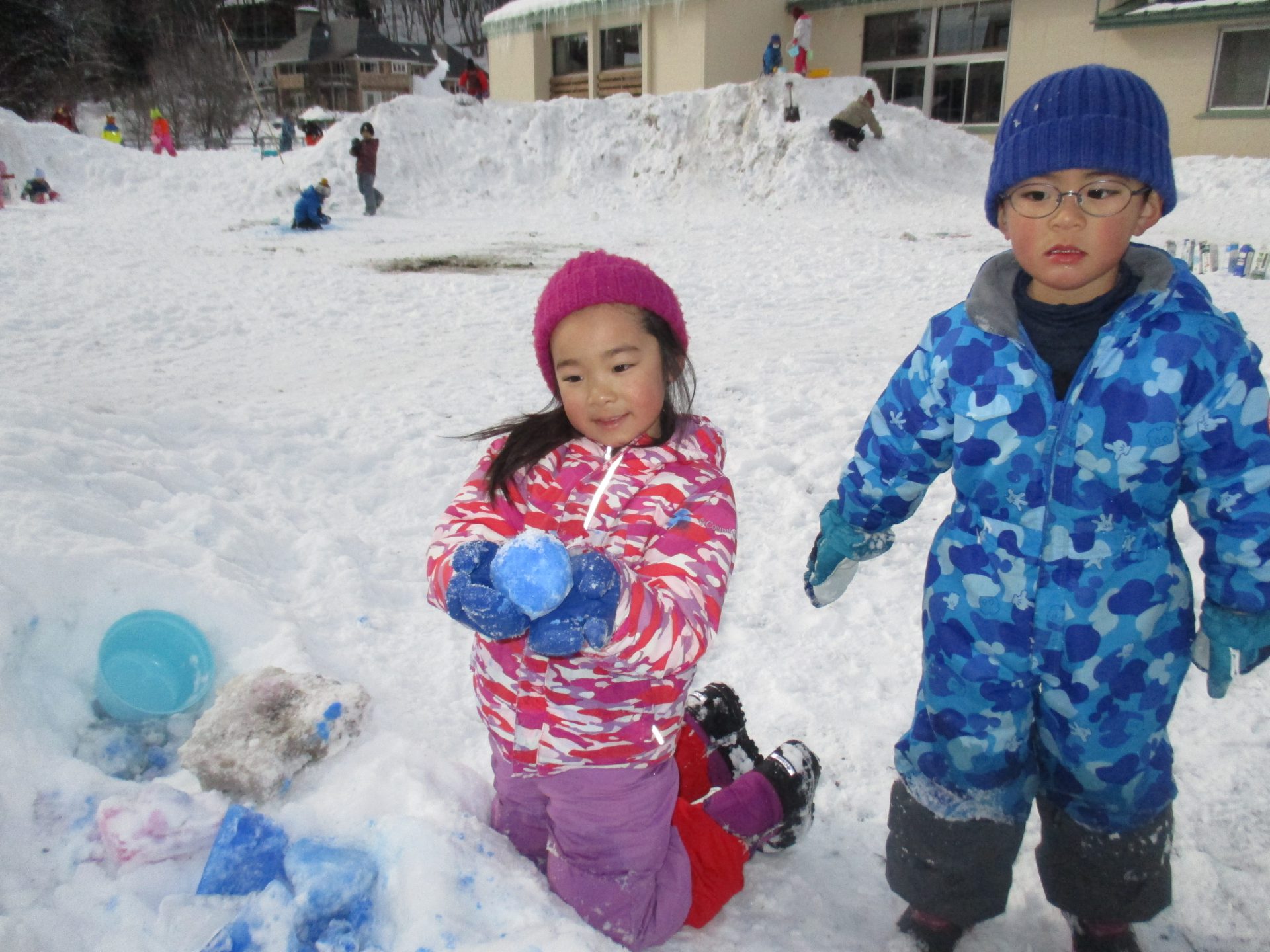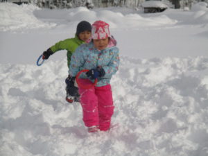 ふかふかの深雪をかき分けて、雪上宝探しやリレーで汗をかくほど遊んでいます。