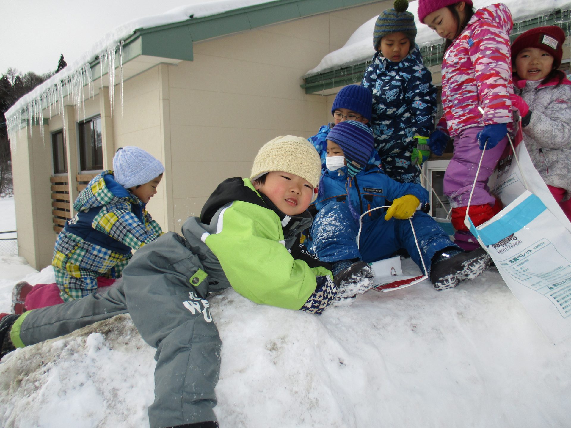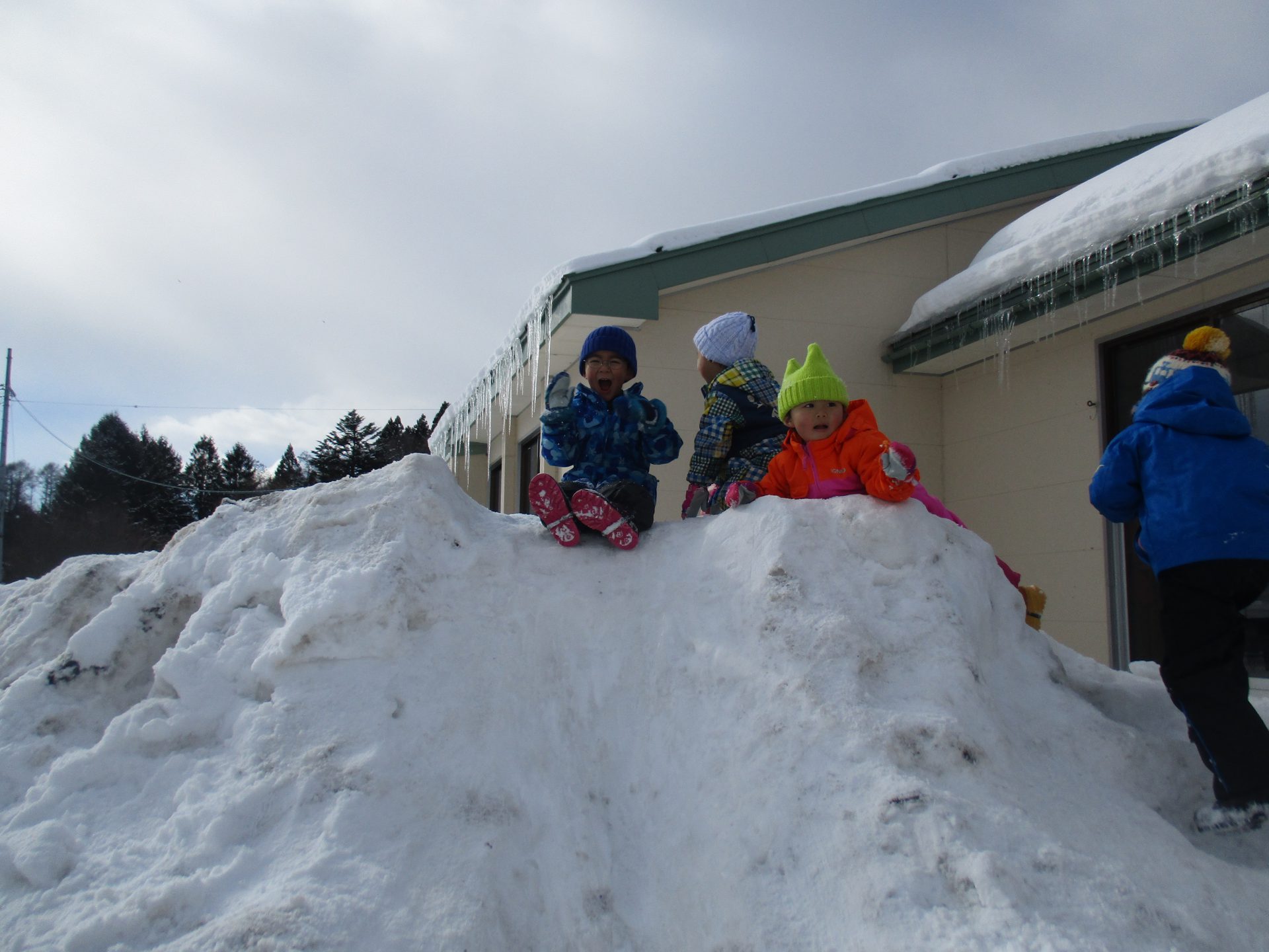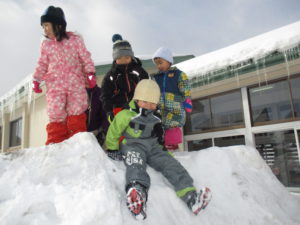 その大きな雪山に駆け上がり、我先にと尻すべりをする子どもたちです!